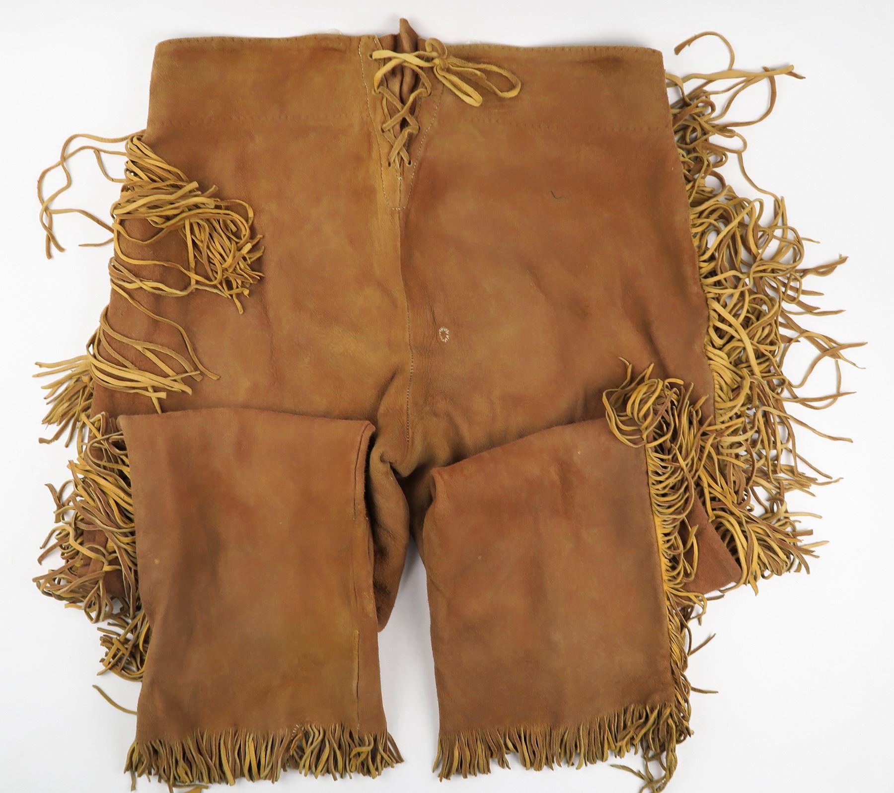 This set contains one possibles bag of modern construction that includes a Ted Cash tinder box with magnifying glass and tinder, one frontier compass in brass case, a second Ted Cash tinder box with well made tinder cloth oval shaped with hinge, a packet of Payn & Nuaghton's James River Cavendish tobacco un-opened, a handmade iron spoon, a length of artificial sinew, an unopened box of sewing needles by S. Allcock & Co. from Redditch, England, a frontier tortoiseshell beard comb, a trapper's wood bait bottle, an un-opened bottle of High Plains Animal Lure beaver bait (un-opened and like new do not open indoors unless you want to smell like EAU DE PARFUME DEAD SKUNK), frontier pocket knife in poor condition, a full length fringed tobacco bag, two pair of half-leggings (botas) elk hide and cow hide, one elk skin fringed jacket about size Medium, two pull over elk hide trapper's shirts size Medium, one pair of elk skin leggings size 38-40 adjustable and professionally made like new condition, high top moccasins homemade size 10-11. All buckskin clothing appears to be like new condition. C.1980's. Please see photos for details.