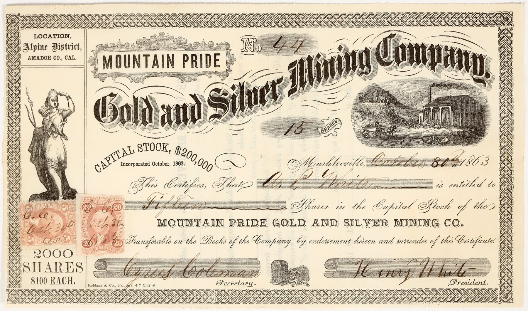 Very rare; we have no records of selling this! "Location, Alpine District, Amador Co. Cal" printed at upper left. Inc. October 1863. Rare Markleeville dateline. No. 44, issued for 15 shares to AP White in October 1863. Signed by president Henry White and secretary Cyrus Coleman. Not cancelled. Allegorical and mining vignettes. Two revenue stamps. Folds, clean. 5.5 x 9" No additional information located on newspaper databases.