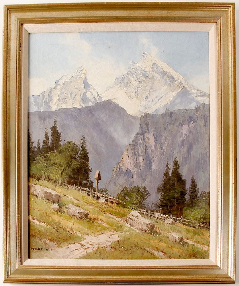 Mountain Scene by Ernst Carl Walter Retzlaff (1898-1976). Oil on canvas, 20" x 16", framed 23.5" x 19.5". Painting shows some crackling, but is in good condtion. Signature is E. C. W. Retzlaff. Numerous Alpine and mountain panoramas were created. Typical for him are oil paintings a paint application with trowels and the use of the template of appropriate colors. His manner of painting can be described as naturalistic, with the respective mountain always standing in the foreground and settlements, as shown in the picture, are merely indicated. The spatula technique also enabled him to work expressively.