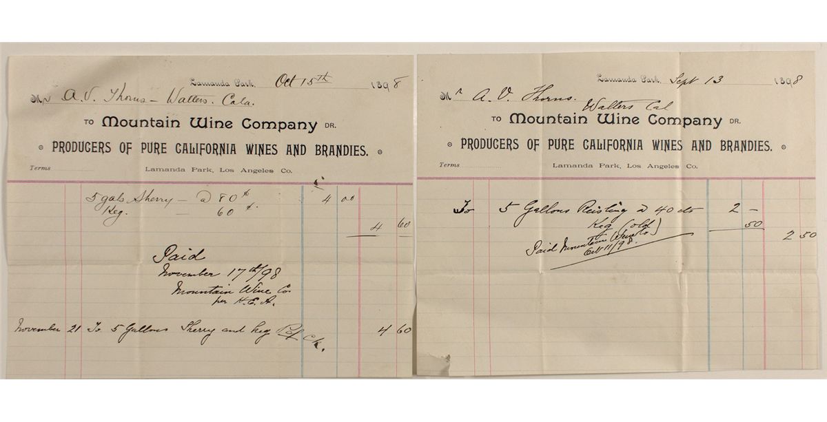 This pair has a lot going for it. Lamanda is now part of Pasadena. The billheads are to A. V. Thorn of Walters, California. I could find not information on Walters, but it must be somewhere near Angels Camp. One bill is for sherry and one is for Riesling.City: Lamanda ParkCounty: Los AngelesState: CADate: