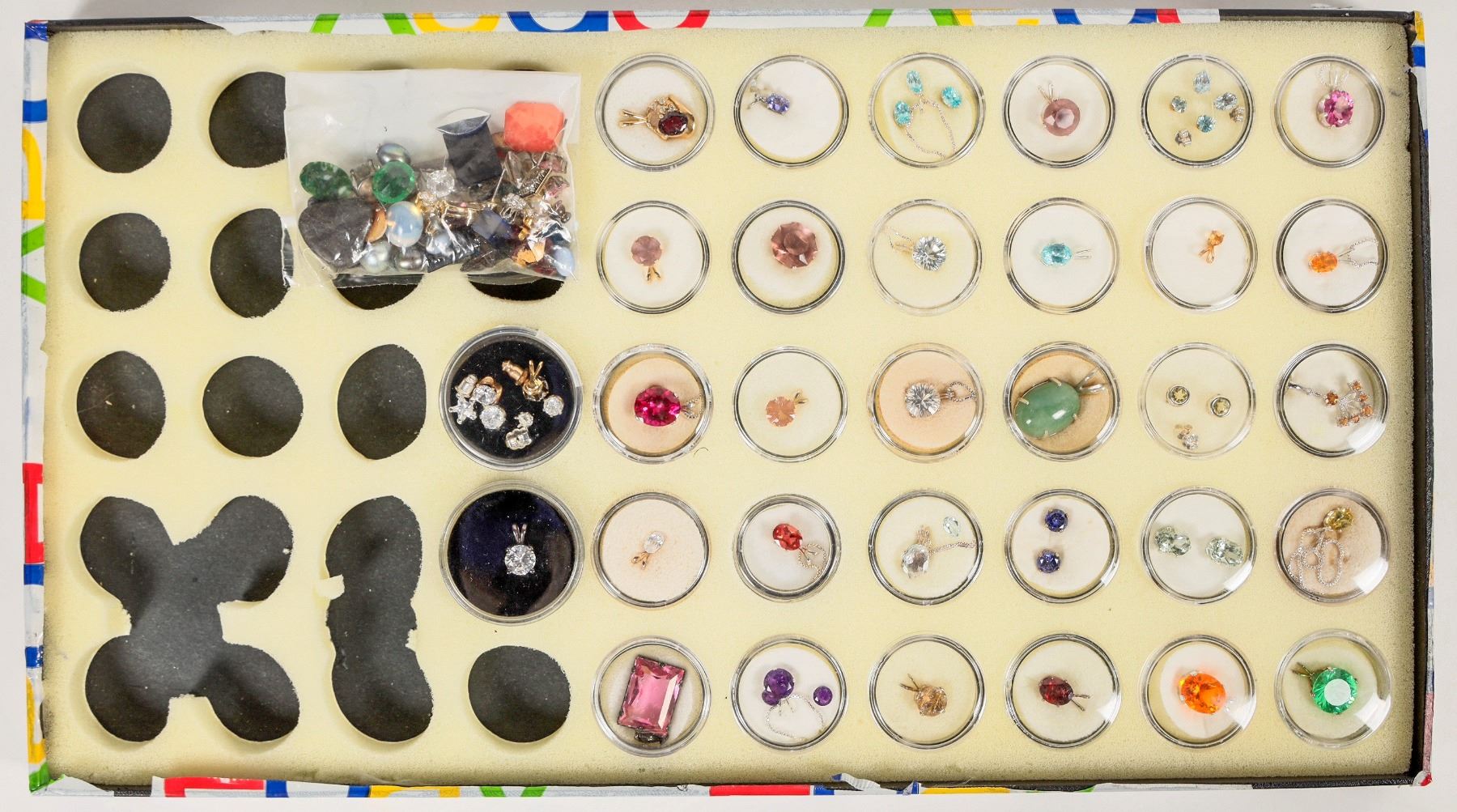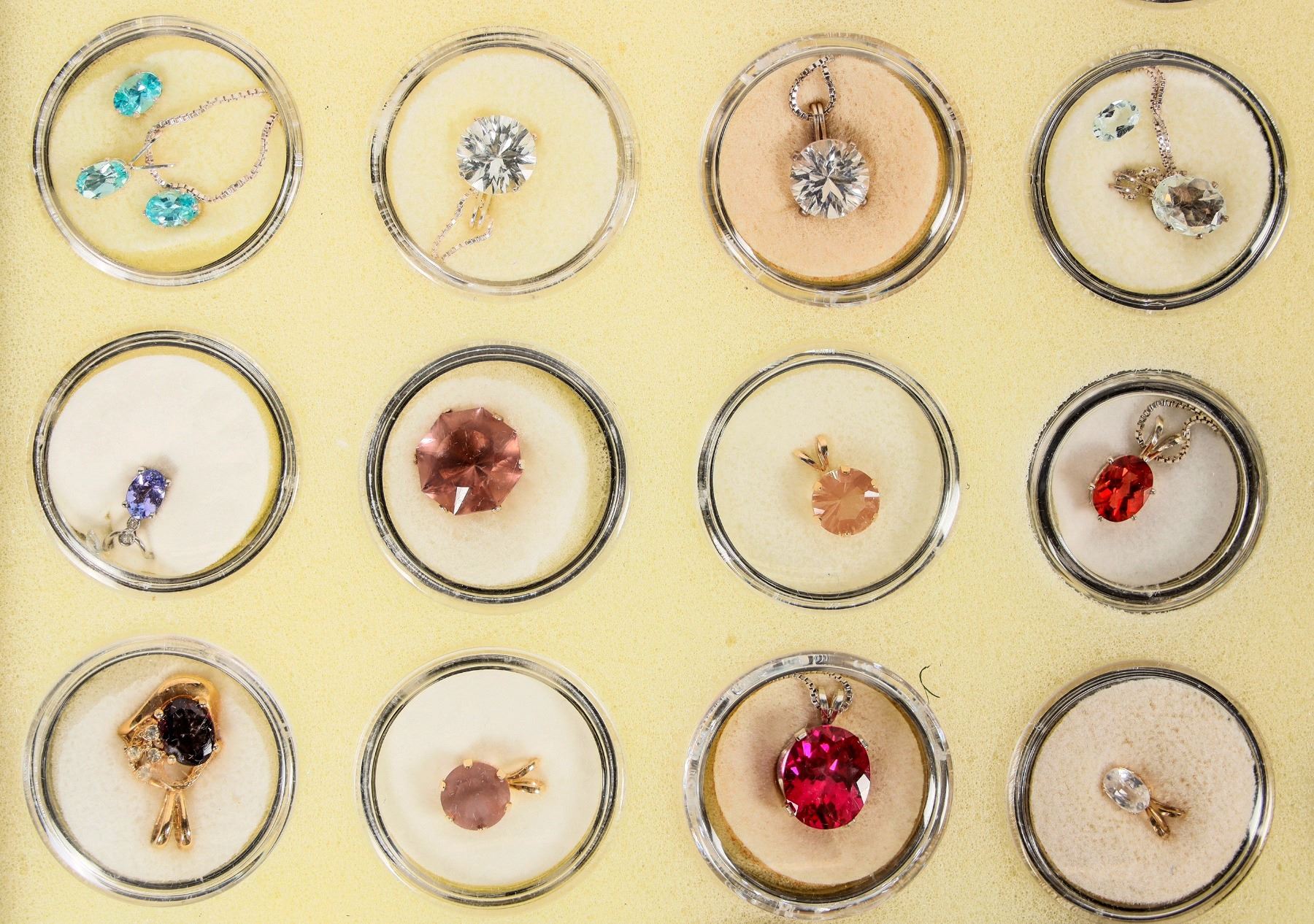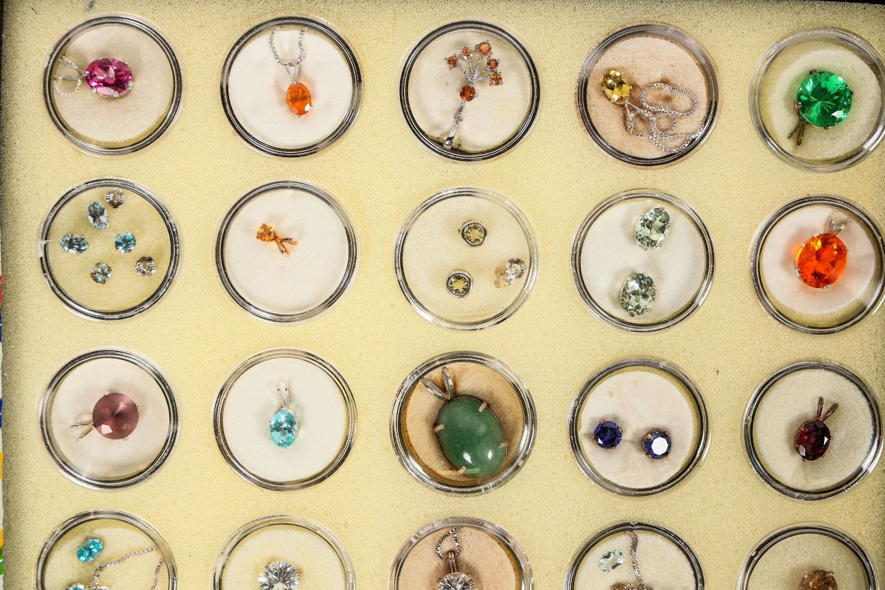 Mounted Faceted Gem Collection in 1" circular gem holders. 33 containers overall faceted gems all mounted for pendants or earrings. About 50 pieces overall. Very colorful. Includes: Mandarine, Ice, lab sapphire, tanzanite, apatite and more. Please inspect, an excellent lot. About 1mm up to 1.5cm. Numerous different faceted shapes and hues.