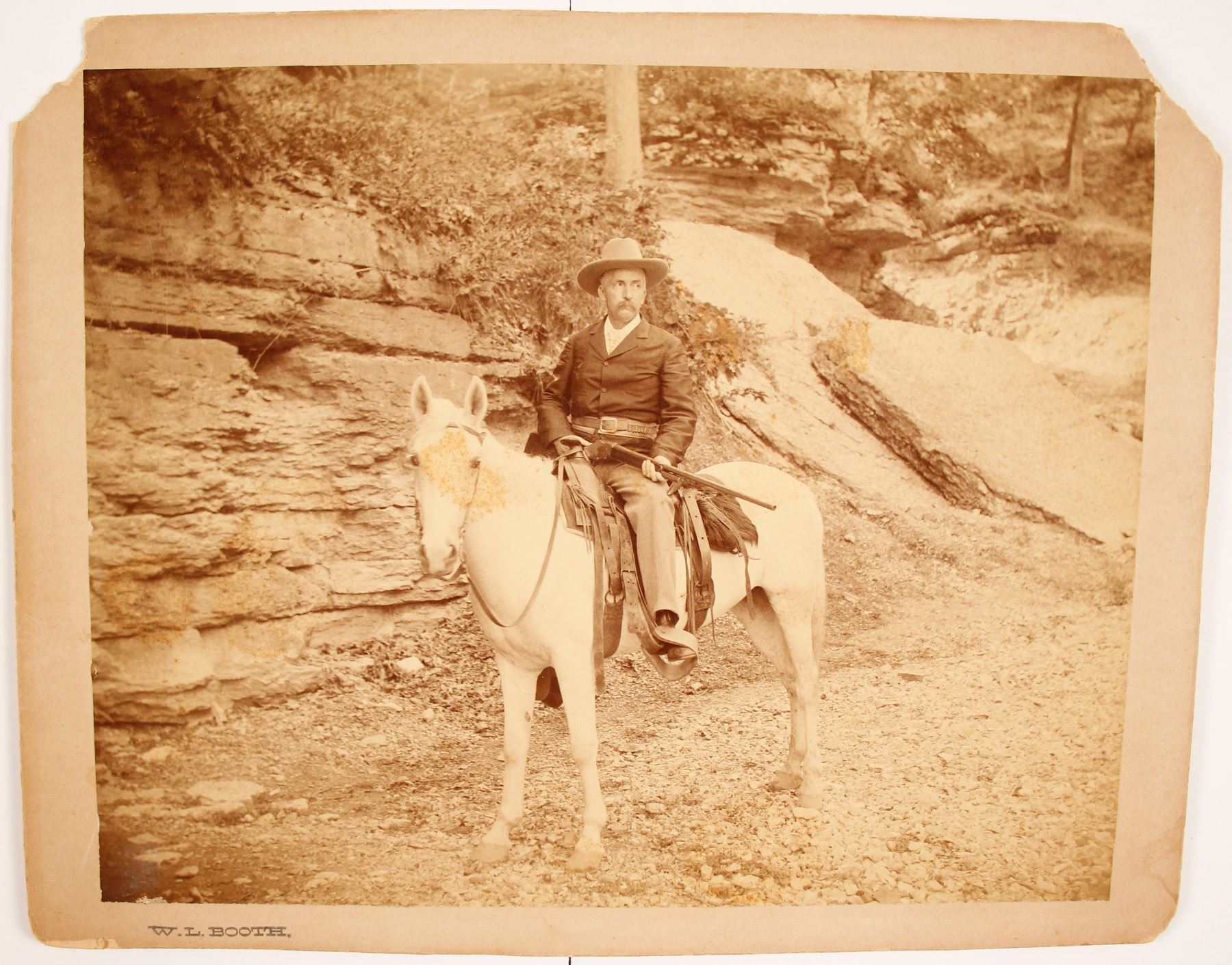 7 x 8.75" photograph on 8 x 10" mount. Photographer is W.L. Booth. Chips to mount, some wear to photo (most prominent on horse's head). Shows man on white horse with rifle. Reverse provides the identification: "James K. Wilson, Mrs. Castleman's first husband, Eureka Springs, Ar." Date: c.1890s City: Eureka Springs State: Arkansas HWAC# 77576