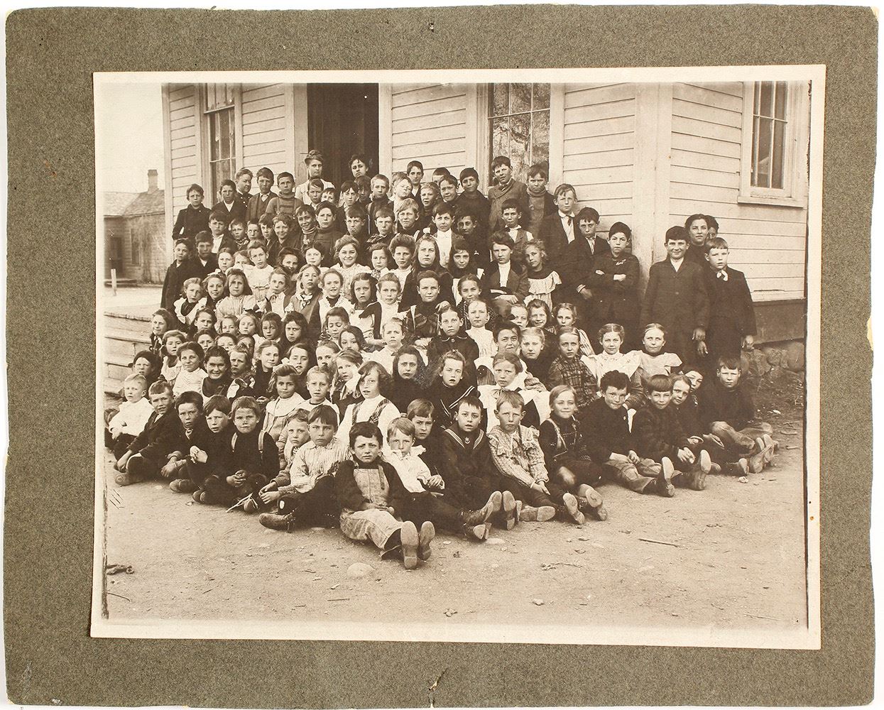 Early mounted photograph showing large group of schoolchildren on steps in front of school building. Reverse has pen notations identifying it as the famous 4th Ward School in Virginia City, Nevada. Photo is 6.5" x 8.5" on 8 x 10" board. Chips and cracks to board. Provenance: Ayer Family Estate. Please see other Virginia City, Gold Hill, and Reno photographs from this family collection. Date: Location: Virginia City, Nevada HWAC# 55521