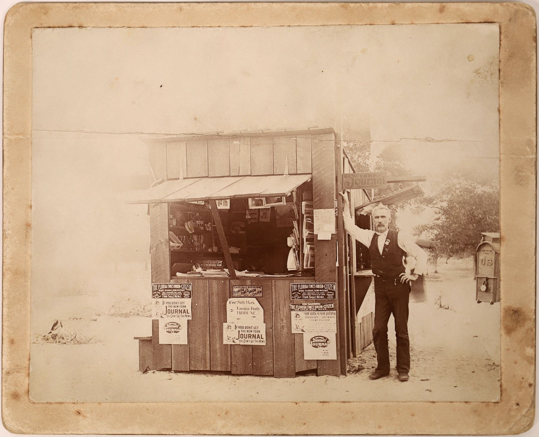 Mounted photograph of a man standing next to a newspaper shop. No location is given, but a few signs on the front advertise Florida newspapers. 3.75 x 4.5" photo on 4.25 x 5.25" mount. Horizontal creases and soiling.