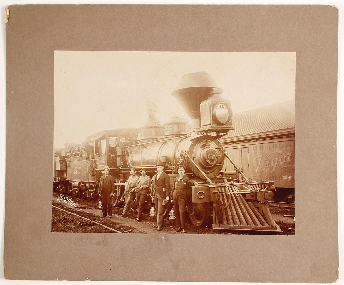Five men (three with lanterns) posing next to locomotive for the Oregon & California Railroad (visible on side of car). Photo by E.A. Smith. Reverse has pencil notations saying that the photograph was taken April 24th, 1901 at Portland, Oregon. 6 x 8" photo on 9 x 11" mount. Some wear: staining and scuffs. Nice contrast and detail. The Oregon & California Railroad dates back to 1869. In 1887, the line was completed over Siskiyou Summit, and the Southern Pacific Railroad assumed control of the railroad, although it was not officially sold to Southern Pacific until January 3, 1927. HWAC# 60055 Date: 1901 Location: Portland, Oregon