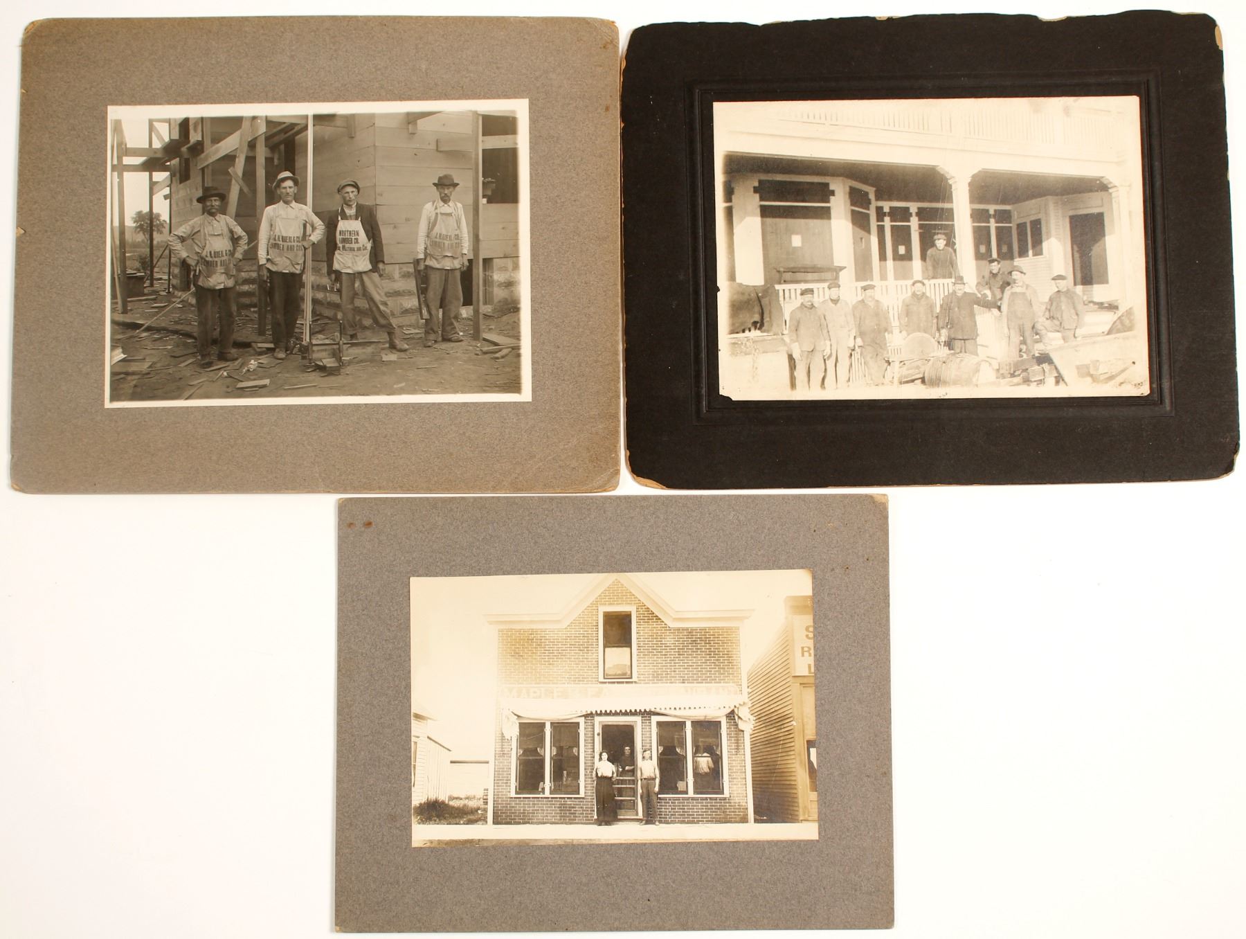 Lot of 3. None identified. One shows a group standing in front of a Maple Restaurant (4.25 x 6.5" on 7 x 9" mount); another shows four workers with JH Quel & Co. Lumber shirts (5x7" on 8x10"); and the last shows nine people posing in front of a business (5x7" on 7.75 x10" mount).