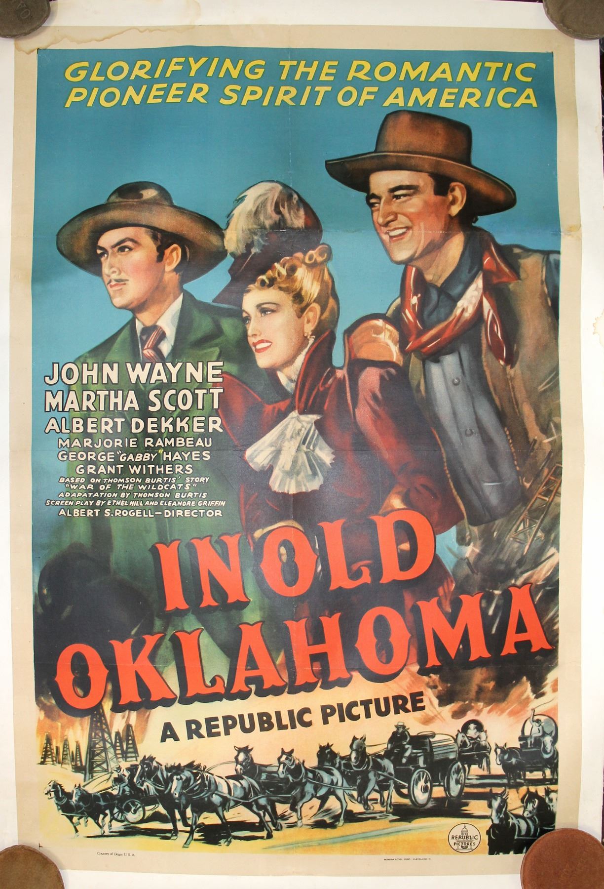 Very beautiful, full size , and believed to be the real deal and original. The move started John Wayne, Martha Scott, Albert Dekker, and a bunch of other swell folks. Do you remember " Gabby " Hays ? he was in there too. The poster is mounted on canvas, and is 40 1/2" tall x 27" wide. Of course is a little bigger for the canvas margin. In the lower left corner it says" Country Of Origin U.S.A". Near the right lower corner is also: Morgan Litho. Corp, Cleveland , O. In the lower right corner the Republic Pictures Logo, and the serial # 25158. The condition is really nice, with only a few minor fold lines. Also minute water damage, in the upper left corner. If framed a really great piece to behold.( RH).