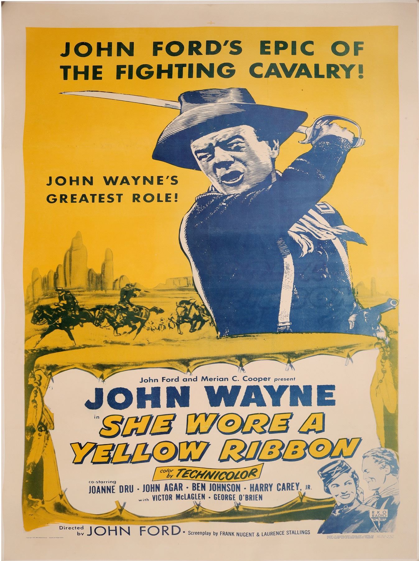 Here we have a beautiful poster. Its a" RE PRINT" and not the original from 1949. But, it looks great . In this movie " John Wayne" is Captain Brittles and fighting the Indians, in Monument Valley. Also staring Joanne Dru , John Agar, and a lot of other famous folks. The colorization of the poster is really good, yellow back ground and blue uniforms( That was the colors of the Calvary). Also, this poster is mounted on canvas ( It is called " Canvas Art "). If framed. it would be beautiful, for your man cave or with your other western collectibles. Size is 45 1/4" tall x 31" wide. Perfect condition. ( RH ).