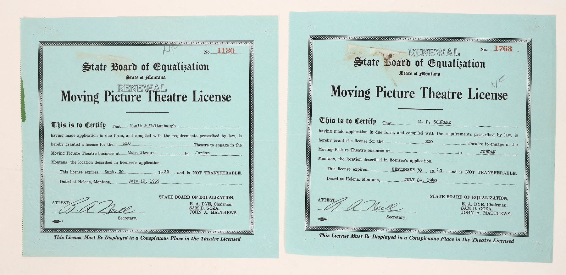 Two Moving Picture Theater Licenses issued by the Montana State Board of Equalization. Both are stamped with the word 'RENEWAL'. The licenses are made out to Nault & Waltenbaugh in 1939 and M.P. Schrank in 1940, and are labelled No. 1130 and No. 1768 respectively. Both licenses are for the Rio theater on Main Street in Jordan, Montana. They bear the official seal of the State Board of Equalization, and are signed by secretary R.A Neill. [ Jordan Montana