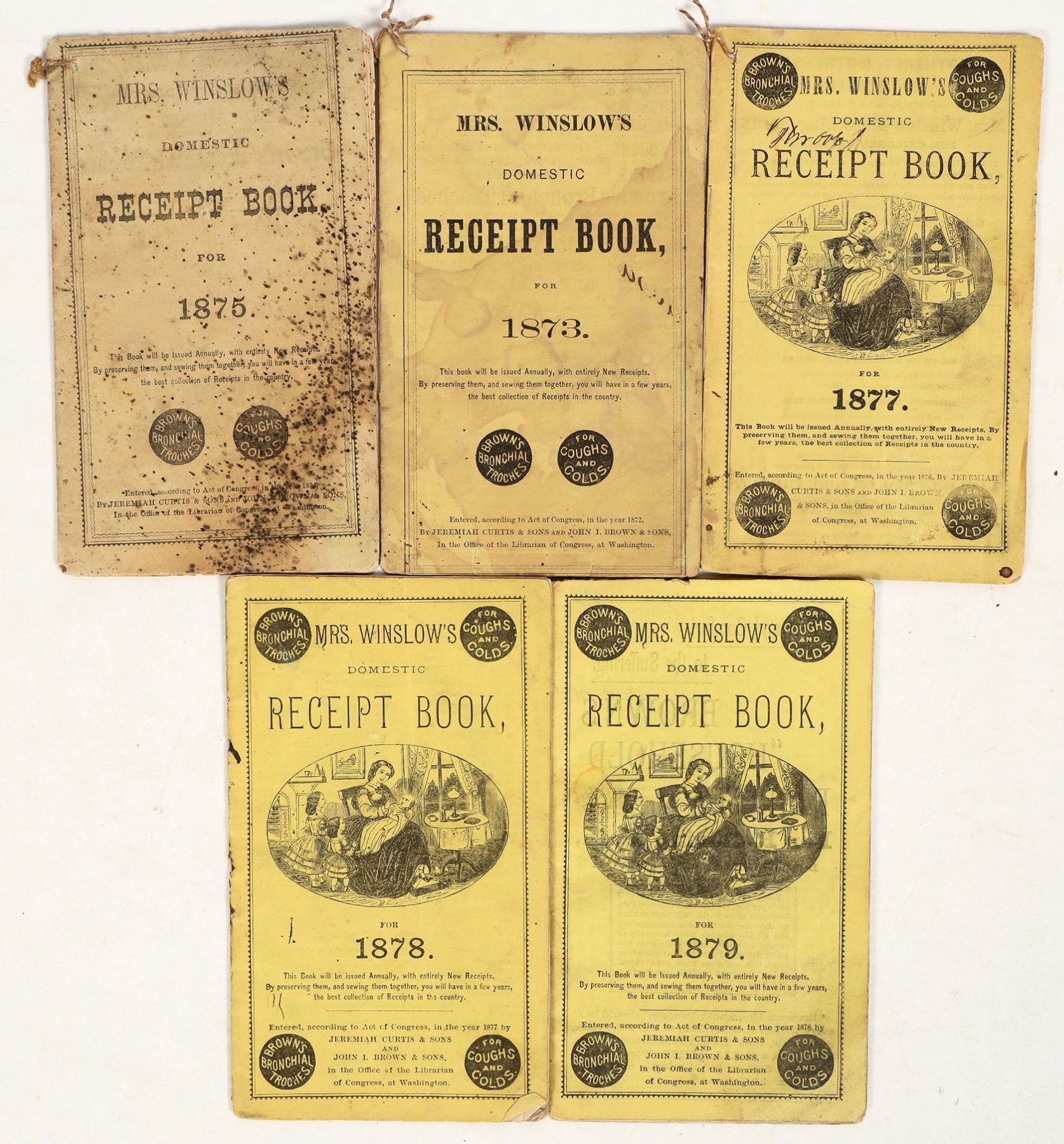 lot of 5. Description Mrs. Winslow, a Physician and nurse, has compounded soothing syrups for children's ailments. Contains recipes. Issued annually. These are books containing various children ailment descriptions w/suggested remedy. Cond. is fair to good. 32 pgs in ea. book