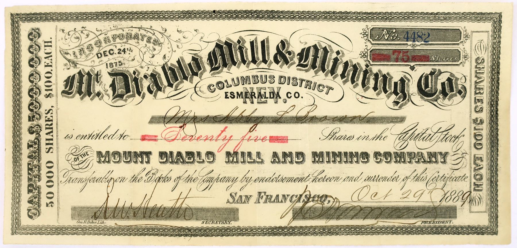 "Columbus District, Esmeralda Co., Nev." (printed under title). # 4482 for 75 shares to Mrs. Abby Brown on October 29, 1889 in San Francisco. Incorporated Christmas Eve December 24, 1875. Signed by president W. E. Norwood and secretary R. W. Heath. Ornate border and fancy black font. Printed by GH Baker Lith., SF (Seldon seen printer). Fancy scroll work at top. Pinholes, folds. The Mount Diablo paid at least 17 dividends from 1875 to 1891. Originally used the Sweetapple & Hazeltine mill in Candelaria. Built their own mill at Sodaville in 1887. In an 1892 report by the company secretary, the company had 4,170 ft. of drift, crosscuts, and winzes. Total bullion shipped in 1891 was $373,000. The mill crushed 9,695 tons of ore from the Mt. Diablo claim. "The general appearance of the mine is less favorable" but "there is still a good deal of ore in sight." [Ref: Financial and Mining Record, Volume 31, pg. 13] Research information on the mine (2 pages with pictures), district and mining camp of Columbus included.