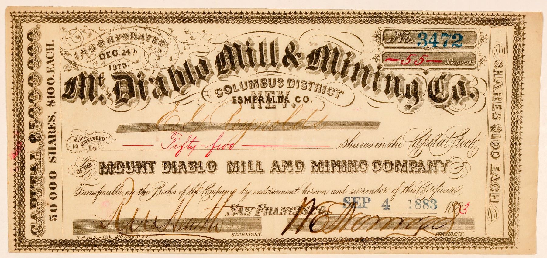 "Columbus District, Esmeralda Co., Nev." (printed under title). Inc. Dec. 1875. No. 3472, issued for 55 shares to E.G. Reynolds on Sep. 4, 1883 in San Francisco. Signed by president W. Norwood and secretary Heath. Ornate border and fancy black font. Printed by GH Baker Lith., SF. 4 x 9" Pinholes, folds. In an 1892 report by the company secretary, the company had 4,170 ft. of drift, crosscuts, and winzes. Total bullion shipped in 1891 was $373,000. The mill crushed 9,695 tons of ore from the Mt. Diablo claim. "The general appearance of the mine is less favorable" but "there is still a good deal of ore in sight." Also mentions the mill had a number of "unavoidable accidents." [Ref: Financial and Mining Record, Volume 31, pg. 13] () Ken Prag Collection