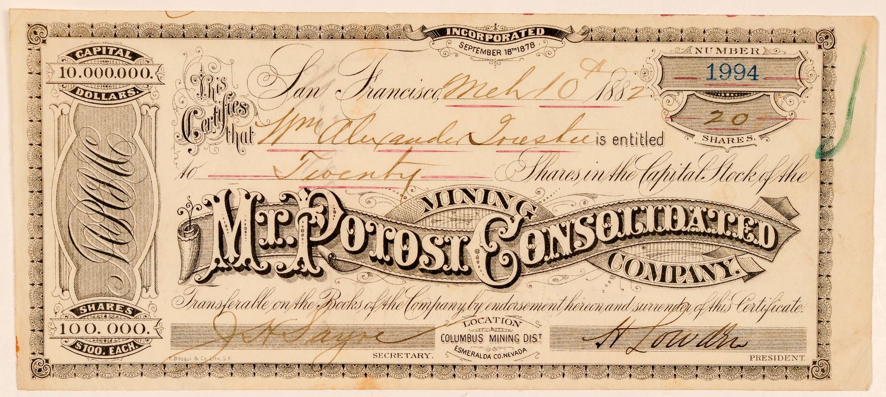 Location: Columbus Mining District, Esmeralda Co., Nevada" (printed at bottom center). Inc. Sept. 1878. No. 1994, issued for 20 shares to Wm. Alexander on March 10th, 1882 in SF. Signed by the president (H Lowden (?)) and secretary (JH Sayre). Not cancelled. Black border and print, very fancy logo and font. Printed by E. Bosqui & Co., SF. 4 x 9.25" Folds, creases in corners, ink stain. The Columbus Mining District is also known as the Candelaria District. It was organized in 1864 and covers most of the Candelaria Hills between Miller Mountain, Little Summit, Tonopah Junction, and Columbus Marsh. [Ref:Tingley] () Ken Prag Collection