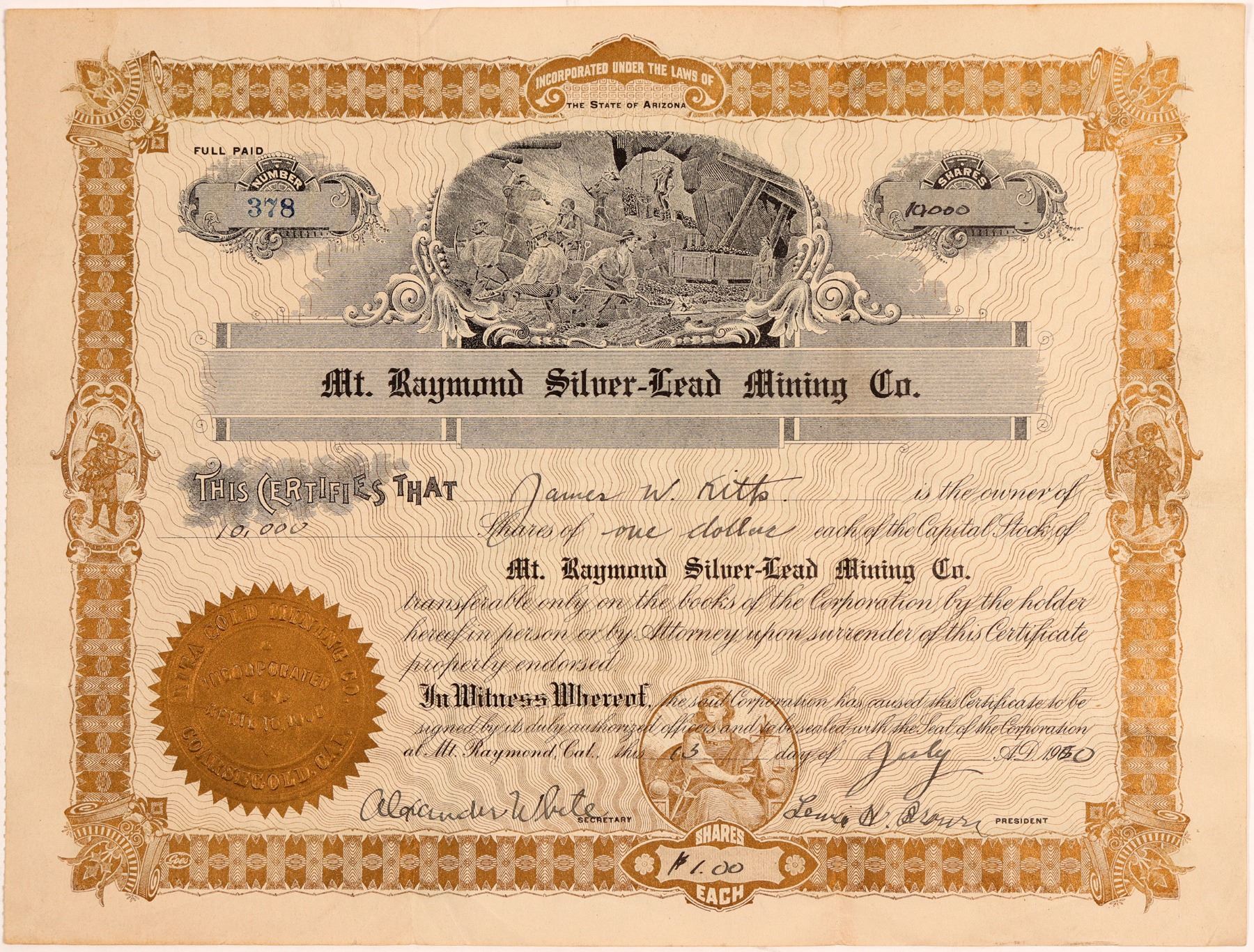 Inc. in Arizona. No. 378, issued for 10,000 shares to James W. Kitts on July 13th, 1930 in Mt. Raymond, California. Signed by president Lewis Brown and secretary Alexander White. Not cancelled. Gold border and seal, black print, mining vignette. Heavy folds, toning, some creases. 8.25 x 11" According to the Madera Mercury, 1914 articles, the company was located in the Mt. Raymond Mining District of Madera County, California. Ken Prag Collection
