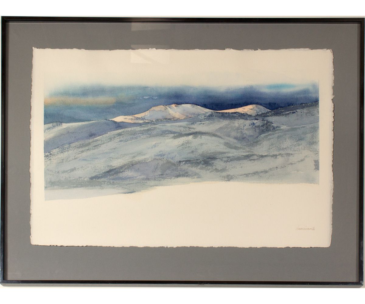 Watercolor landscape painting by Pat Bergstrom. (Framed: 20" H x 27" W). Beautiful blues give the sense of winter in this painting of Mt. Rose.