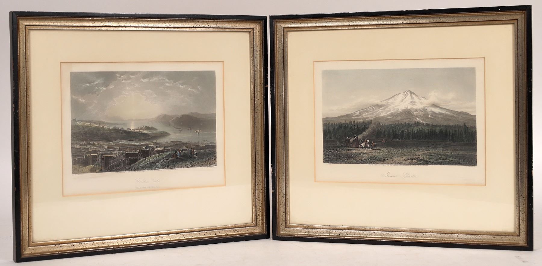 Framed 1873 prints of Mt. Shasta and Golden Gateby E P Branard. W H Holabird provenance. Frames 14x15.5". California