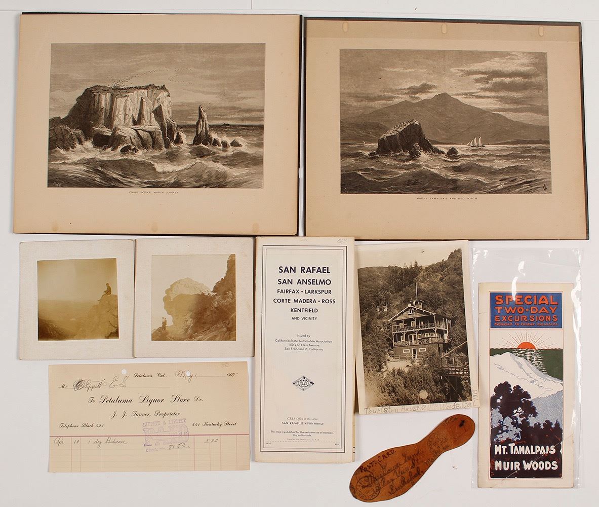 Lot of 9. Includes: 5 x 7" black-and-white photo of Tourist House in Muir Woods, c.1919; two early mounted Mt. Tam photos, 5x5"; two illustrations, Coast Scene in Marin County, and Mount Tamalpais and Red Porch, 9.25" x 12"; CSAA map of San Rafael, San Anselmo, and Vicinity; brochure for Special Two-Day Excursions to Mt. Tamalpais and Muir Woods, repaired; 1908 Petaluma billhead for Petaluma Liquor Store; and leather postcard in shape of foot in sandal, sent to San Rafael. (Prag Collection) Date: Location: Mt. Tamalpais, California HWAC # 54898