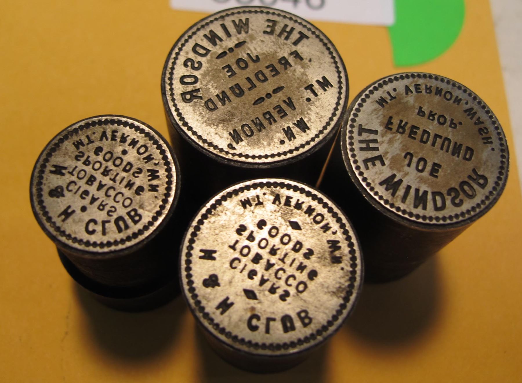 4 token dies self identified from Mt. Vernon, WA. 21 and 24mm: The Windsor. 16 and 24mm: H & H Club. Northwest Territorial Mint Historical Token Die Collection State: Washington City: Mt. Vernon Date: c1903-1950 HWAC# 85046
