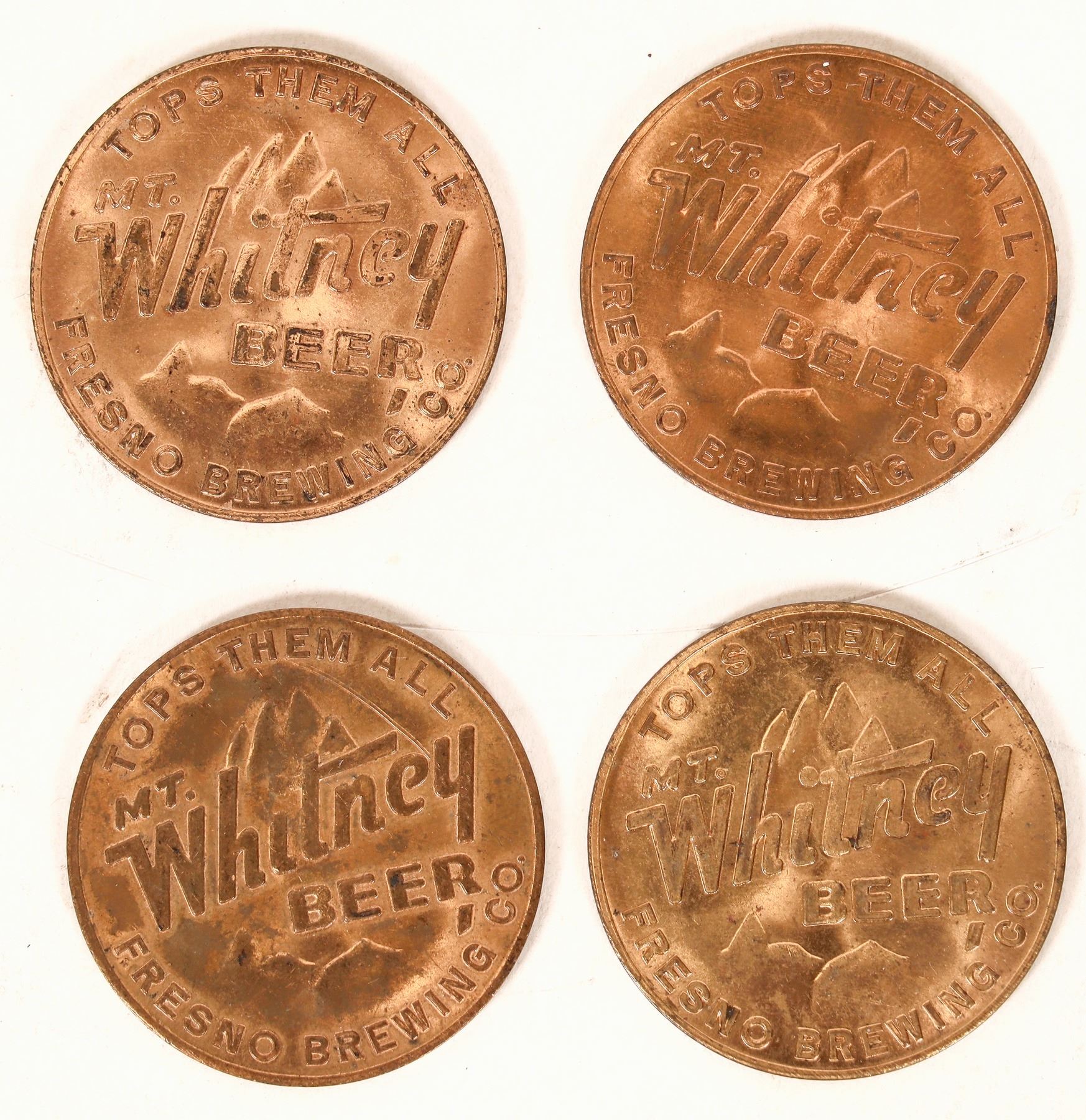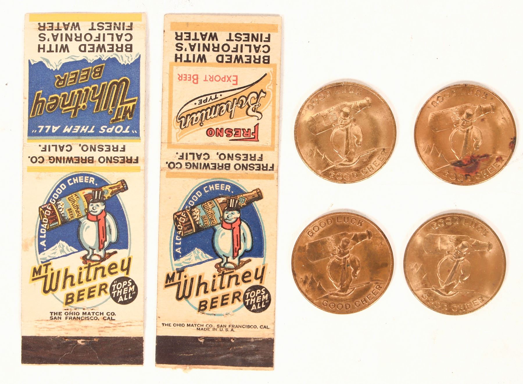 Fresno Brewing Company advertising their Mt. Whitney Beer is brewed with California's Finest Water. Two matchbook covers with a happy snowman; four medals: Tops Them All / Mt. / Whitney / Beer/ Fresno Brewing Co. // Good Luck / (snowman carrying a beer) / Good Cheer; Br., rd., 32 mm.