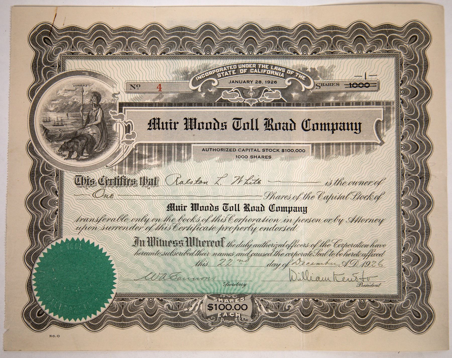 Extremely rare Muir Woods Toll Road Stock, 1926, i/uc, issued to Ralston L White for 1 share. Signed by William Kent Jr as president. The toll road was constructed to reach the Bohemian Club grounds, completed about 1925. The Bohemian Club is one of the most famous intellectual gathering sites in the world.