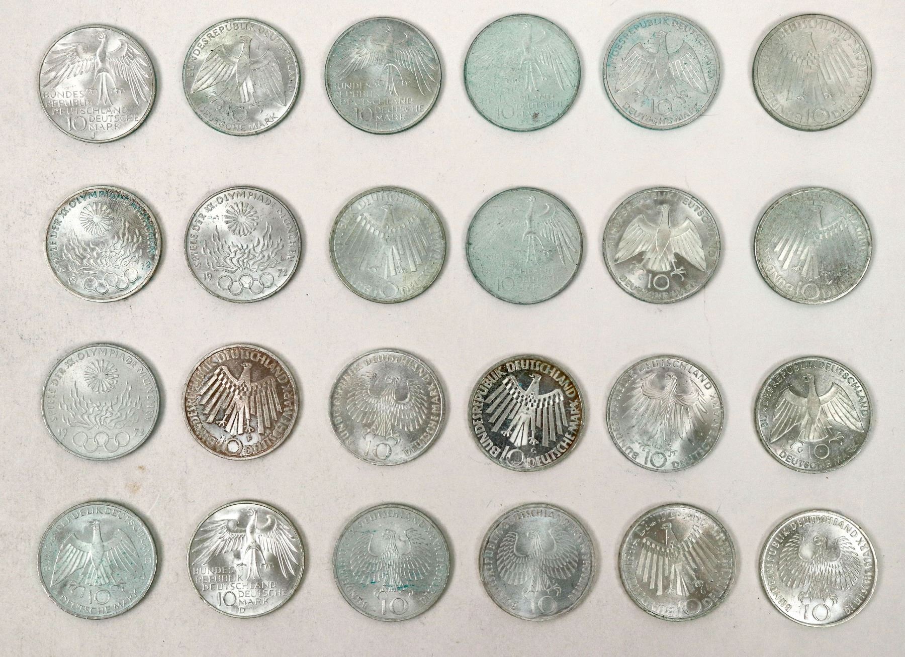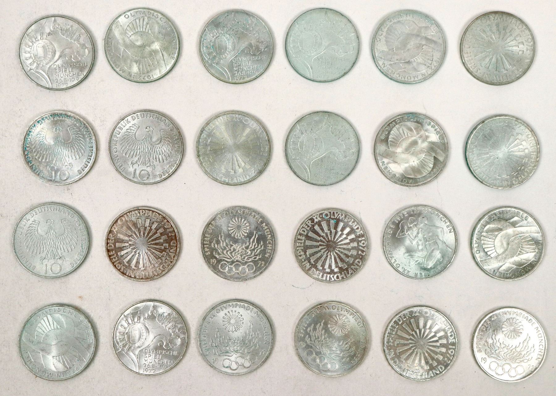 Twenty four uncirculated coins in four different designs commemorating the 1972 Munich Olympic Games on ten Deutsch Mark coins. Coins are silver (.625); 15.5 grams; 32.5 mm. Silver Content: 0.3115 each for a total of 7.47 ounces of silver.