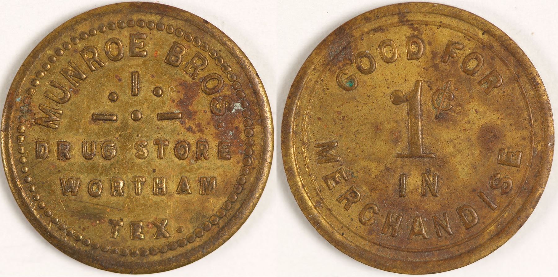 Round brass 18mm MUNROE BROS. / DRUG STORE / WORTHAM TEX. // GF/ 1C /IM. Rare. HWAC# 62447 Date: Location: Wortham, Texas