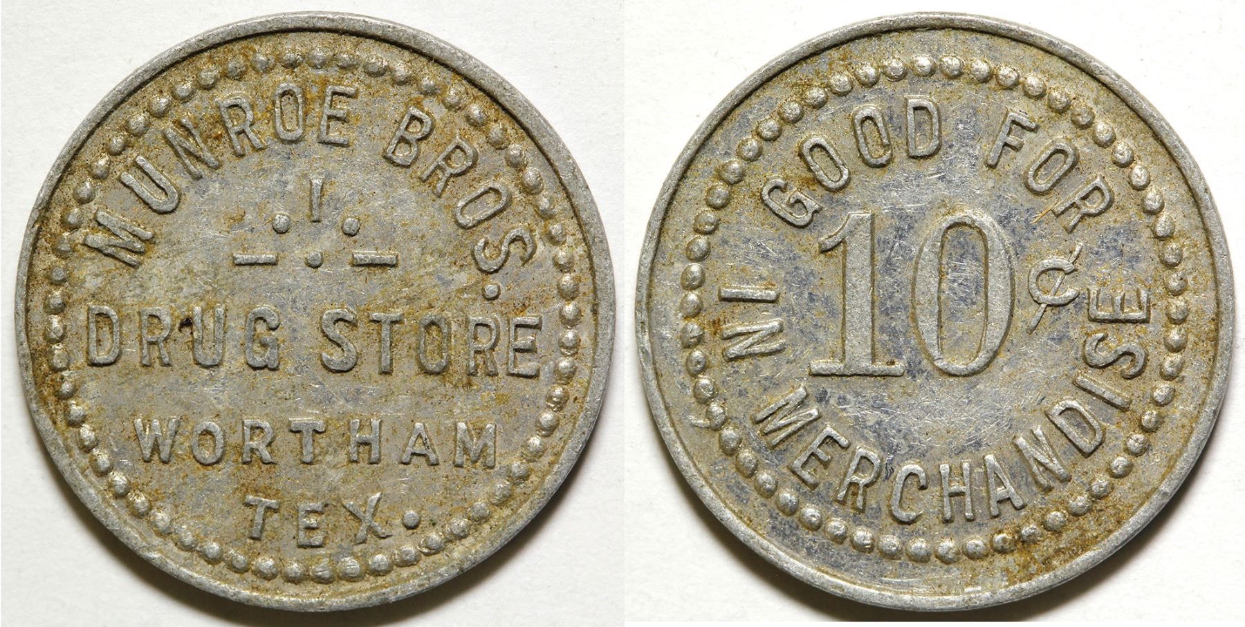 23mm round aluminum, MONROE BROS./DRUG STORE/WORTHAM/TEX.//GF/10c/IM. HWAC# 62501 Date: Location: Wortham, Texas