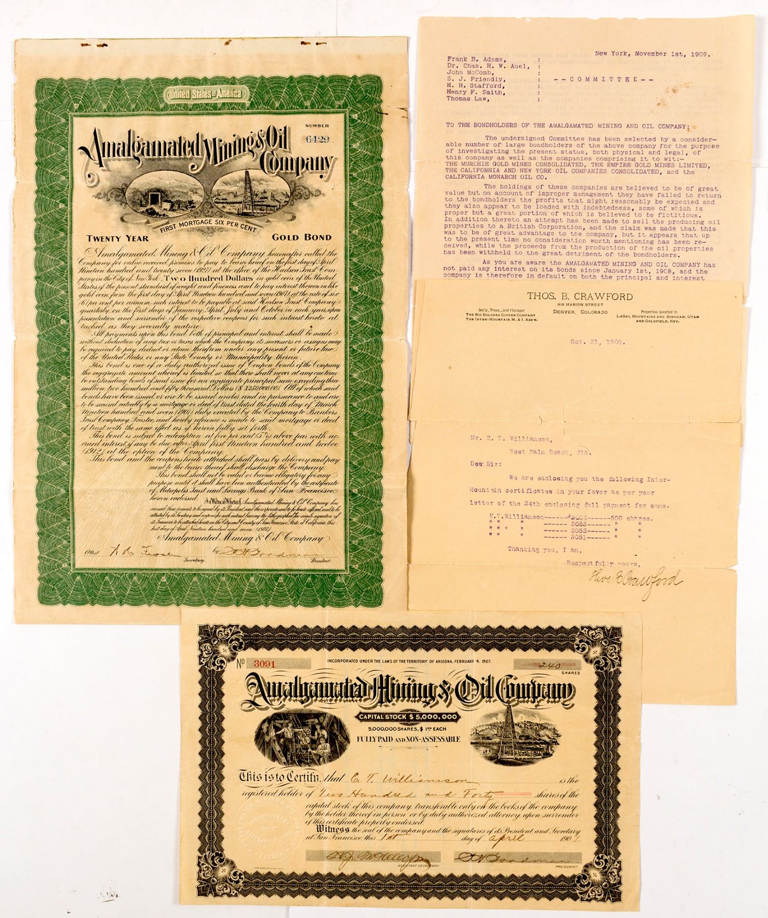 1) The letter acknowledges the new bondholders of these mines (and others) and gives a quick history where things are. Dated November 1, 1909. "The holdings of these accounts are believed to be of great value but on account of improper management, they have failed to return to the bondholders the profits they might reasonably expect. For example the Amalgamated Mining and Oil has been looking for a British investor, but found none. This company has been in default since January 1, 1908. Then there is the Murchie Consolidated of Nevada City. In 1906 the United States Investor devoted a column to this mine. Original investors paid 20 cents a share and now the stock is at $1.00 a share. The mine is being extensively developed until a mill can be found to work the ore. In 1906 the Murchie was consolidated with the Banner, Deadwood, Le Compion, etc. to form the Murchie Consolidated. All I can say is good luck to Frank B Adams publisher, Charles Auel physician, John McComb civil engineer, et al. 2) Amalgamated Mining and Oil Company Stock Certificate. Number 3091 issued to ET Williamson for 240 shares on April 1, 1907. (Purchased after the company quit paying debt!). Signed by Goodman and Hellop(?). Two vignettes: Underground mining and oil. Two vertical folds. No pin holes, dog ears, rips or tears. Fabulous condition! In 1911 the Murchie and the Amalgamated Mining and Oil were mentioned by name as part of a $2,000,000 stock fraud in the Los Angeles Herald! 2) Number 6429. $200. All 80 coupons attached. Signed by W Fraser(?) secretary and Goodman president. Two vignettes: ore cart at mine entrance and oil rig. Some small tears at edges. Three pages total. Each page is 14.5 x 10". In 1911 the Amalgamated Mining and Oil Company was mentioned by name as part of a $2,000,000 stock fraud according to the Los Angeles Herald!