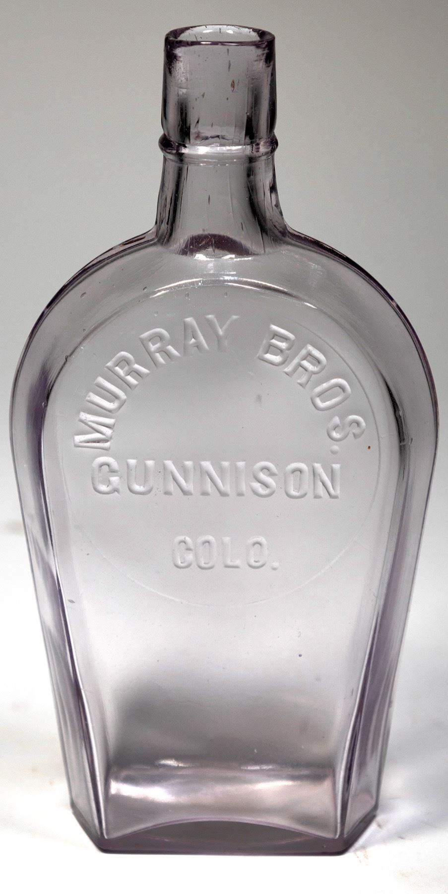 MURRAY BROS./GUNNISON/COLO whiskey coffin flask with collar measuring 7 1/4 inches tall. Purple and beautiful! Knife edge and a neatly applied top. 1 inch rough spot on reverse at base. Great clarity and will likely improve even more with polishing. Very minor nicks at lip. Unmarked base. Preble dates this whiskey pint c. 1893-1901.