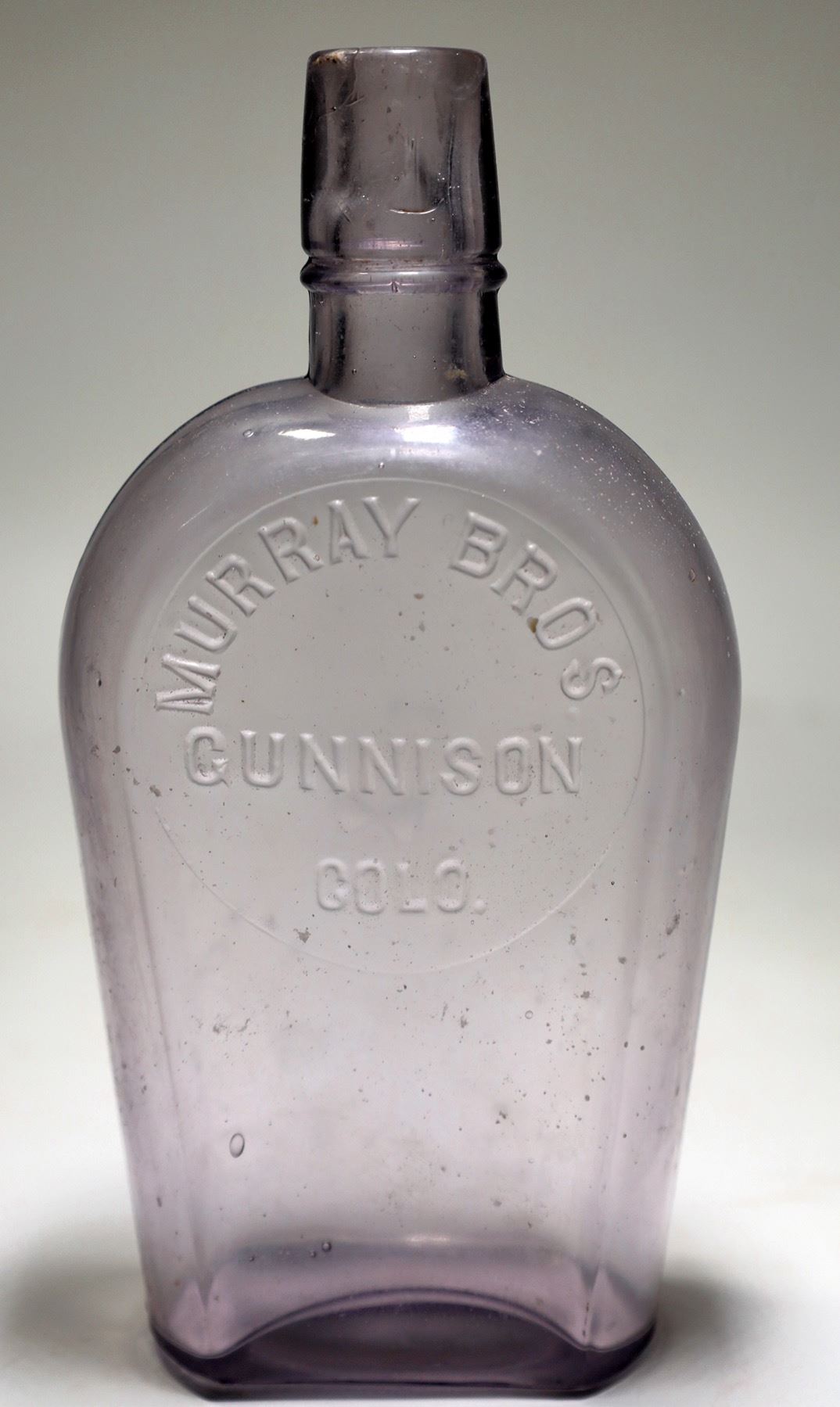 MURRAY BROS./GUNNISON/COLO. SHOO FLY FLASK with unmarked round base. Measures 7 1/2 inches tall, an unlisted height. Wiped top with collar. Purple in color with exterior and interior hazing. May improve with a cleaning. Minor dings on reverse, staining on front lip & scratch marks around and within lip. Closely resembles the Murray pint, w97, Preble dates c. 1893-1901.
