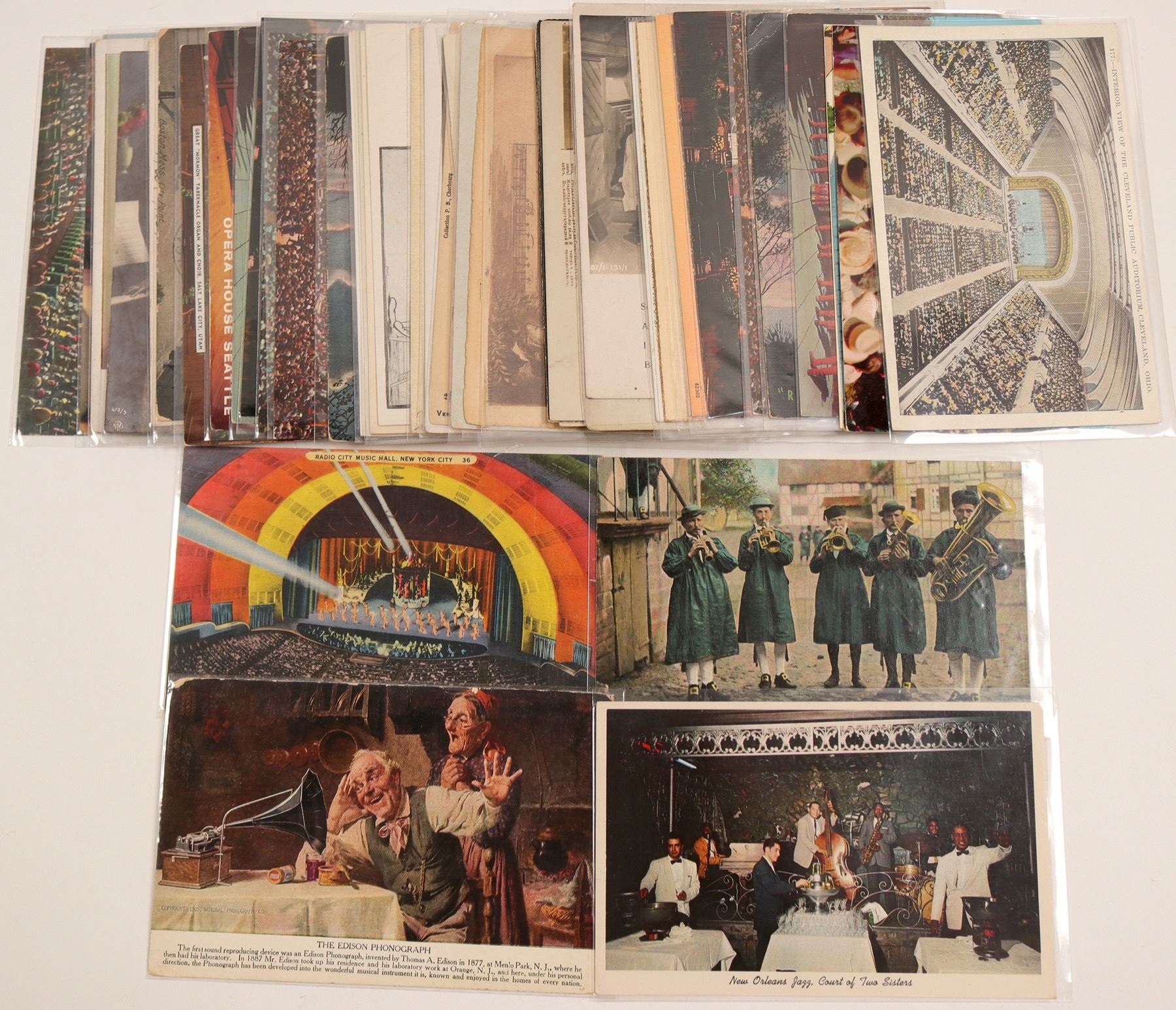 45 postcards that are music related. There are 23 color postcards, 19 black and white and 3 duplicates. Included is the largest pipe organ in the United States at the municipal Organ in Denver Colorado, postcard of Radio City Music Hall, New York City and Mariachis in Guadalajara, Mexico.
