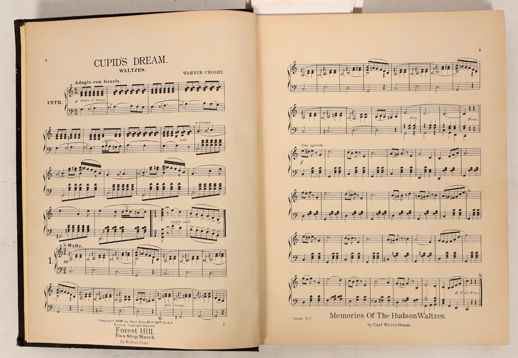 Sheet music bound volume. These are songs (About 40) from the 19th century, with very beautiful engravings on the cover pages. While the name of Cadiz, Ohio resident, Arthur O. Parkison is embossed on the cover board, this book actually comes from the estate of John Bingham, an attorney from Cadiz, who gained world-wide fame as the prosecutor in the Lincoln assassination conspiracy, a successful prosecution that resulted in the hangings of Mary Surratt, Lewis Powell, David Harold and George Atzerodt. This is a big book, measuring 11"x 14" . The boards are nicked and scratched, but in all, it's in decent condition.