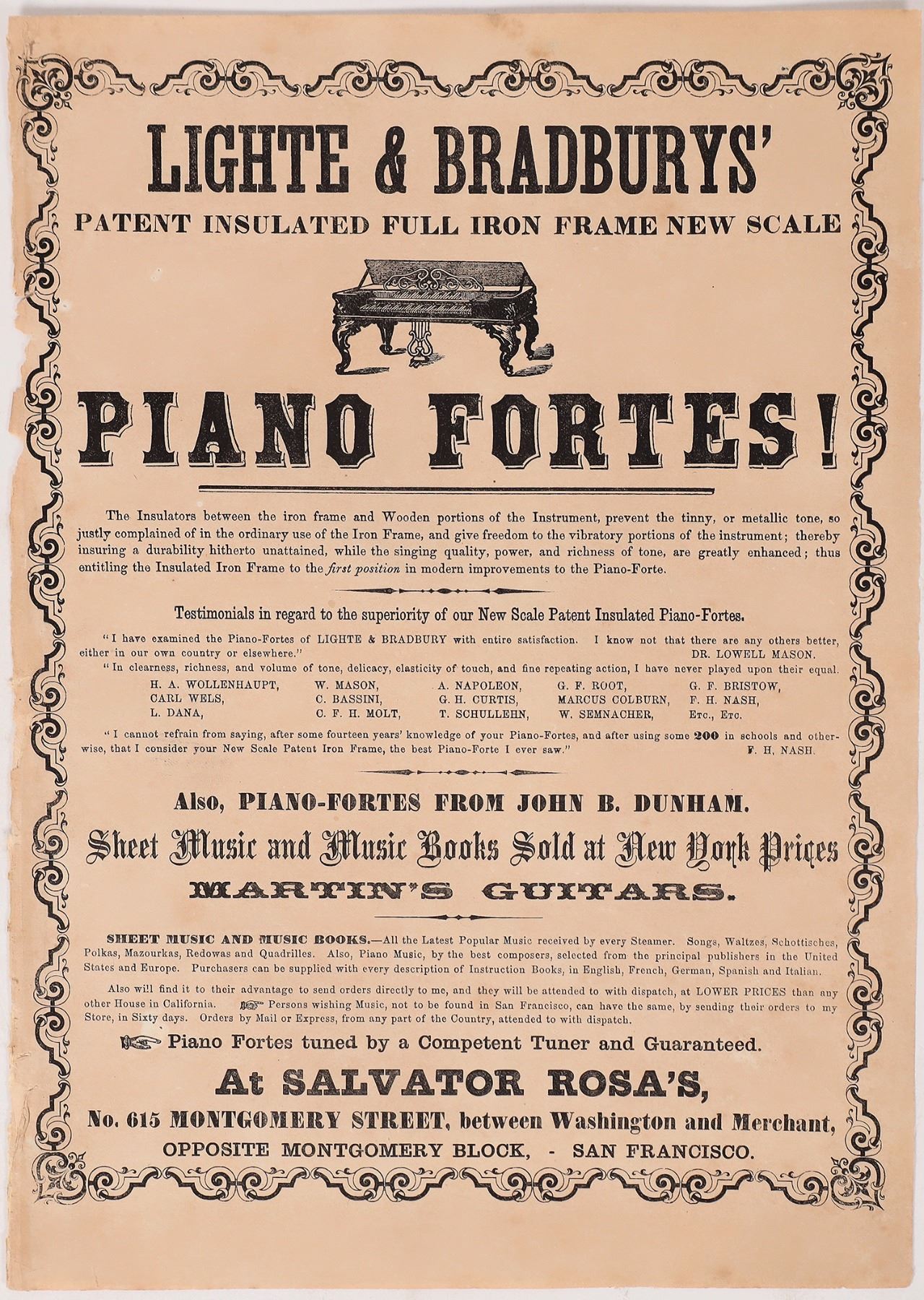 c. 1850's broadside from Lighte & Bradbury's, 615 Montgomery Street, for Martin Guitars and piano fortes. 12x8.5", no creases. San Francisco California