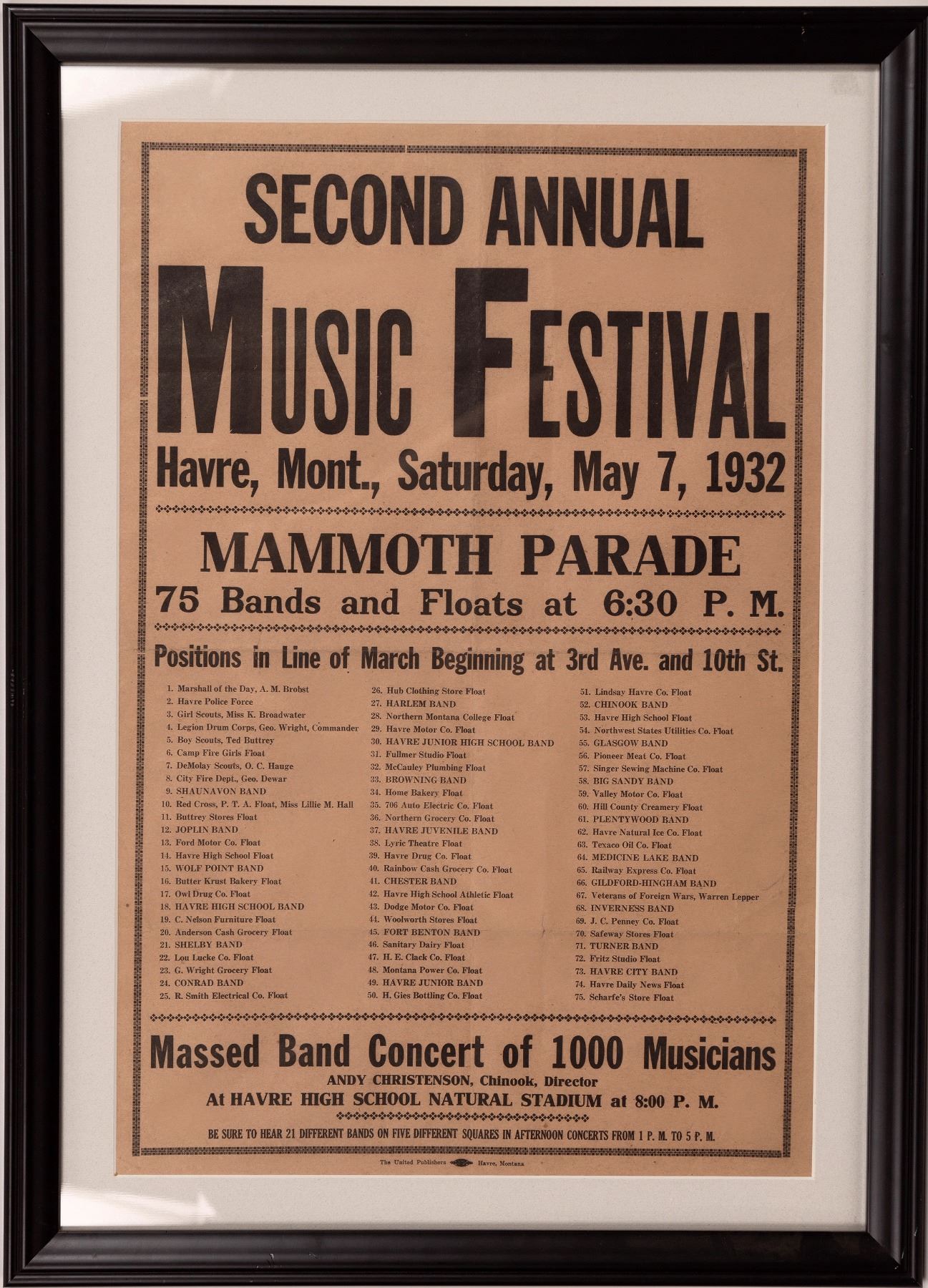 Framed and matted poster advertising the Second Annual Music Festival at Havre Montana, Saturday, May 7, 1932 featuring a mammoth parade with 75 Bands and Floats. Frame is 18 x 25 inches. State:Montana City:Havre Date:1932 Provenance: Stuart MacKenzie Montana Collection