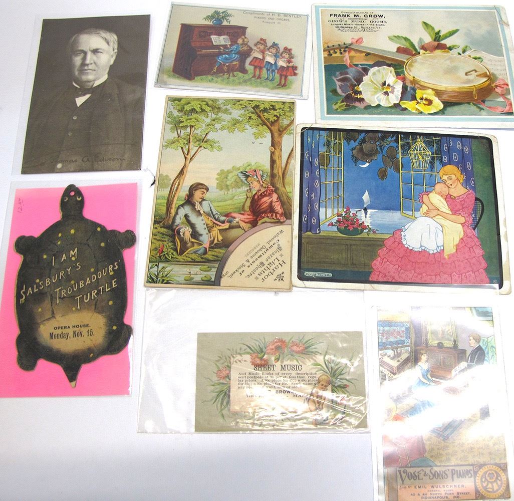 9 music related trade cards and business cards. Vose and Sons Pianos, CP Brown Sheet Music, Maria Forry Pianos, Frank Crow Music Rooms, Little Tots Records, turtle shaped Salsbury Troubadours Turtles, Harbor Lights Alcazar Theatre, HD Bentley Pianos, Thomas Edison photo for Amberol records. Date: Location: HWAC # 54151