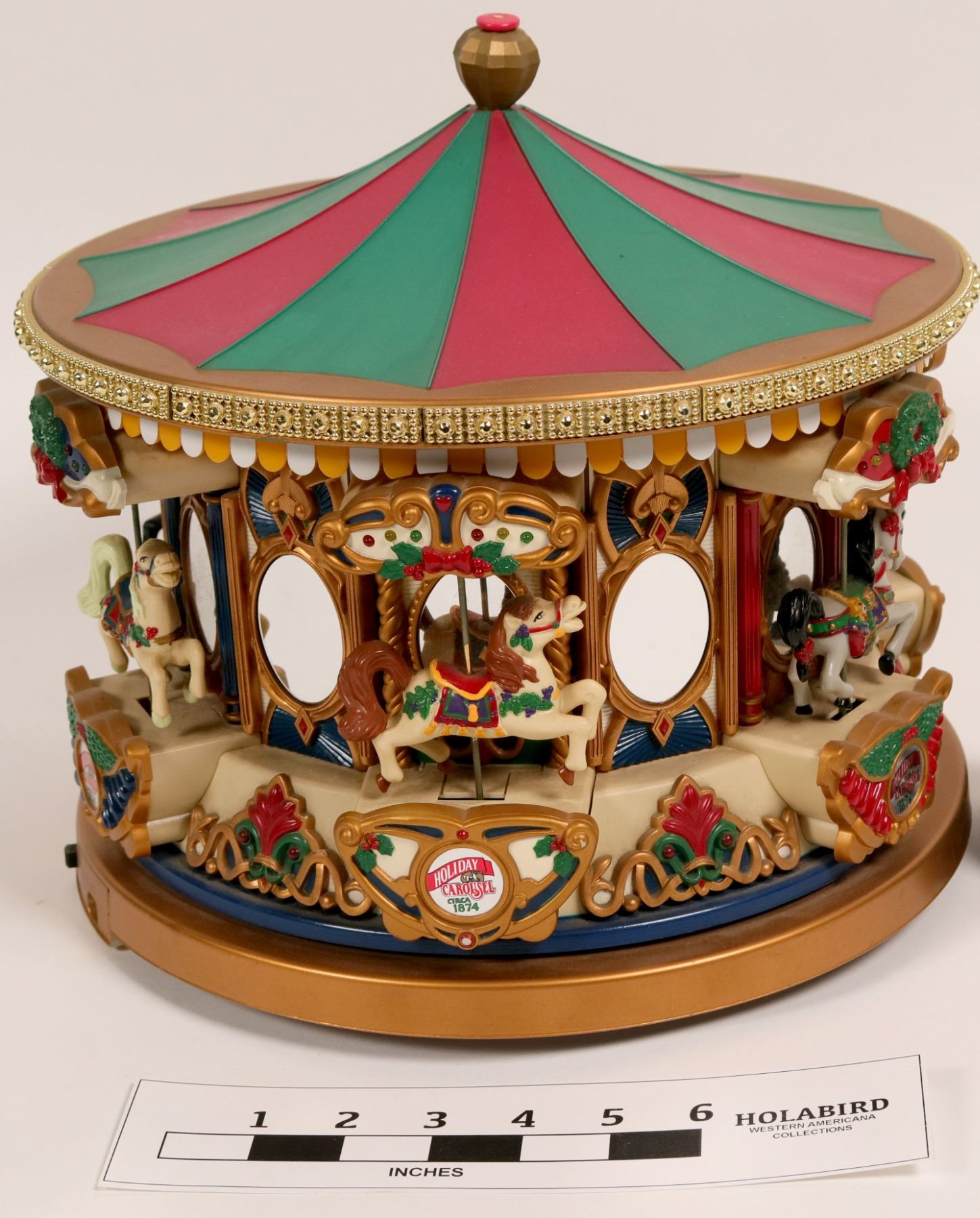 12 in. diameter by 11 in, tall, modern manufacture Mr. Christmas holiday merry -go-round. Needs an 8 volt converter.