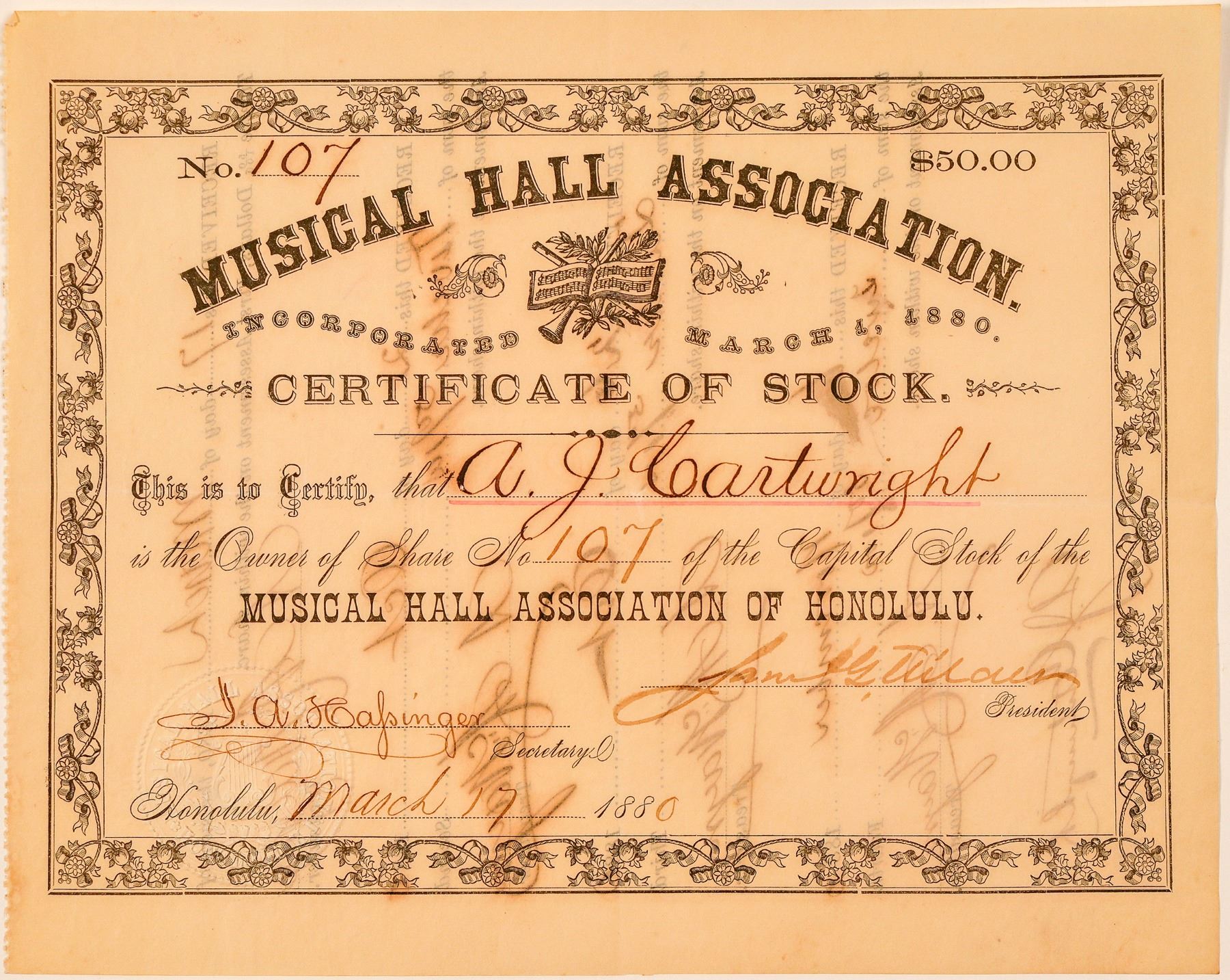 Inc. March 1880. No. 107, issued to AJ Cartwright for one share on March 17th, 1880 in Honolulu. Signed by secretary JA Hapsinger and president James G. Tilous(?). Signed by Cartwright on reverse. Not cancelled. Black print and floral border. Small musical vignette. Folds, toning. 7.25 x 9" His father Alexander J. Cartwright is considered to be the "father of baseball" having been the first to diagram a baseball diamond and creating rules that were incorporated from his Knickerbocker firefighter "town ball" club in New York during the 1840s. Cartwright moved to the Hawaiian Islands after heading to California during the Gold Rush. He served as Honolulu fire chief from 1850-1863 and encouraged the monarchy to bring the game of baseball to Hawaii. He died in 1892. Cartwright was a trustee for this Musical Hall Association. It was a brick building that could seat 500 people incl. two boxes for the royal family and king. [Ref: Alexander Cartwright: The Life Behind the Baseball Legend, Nucciarone]