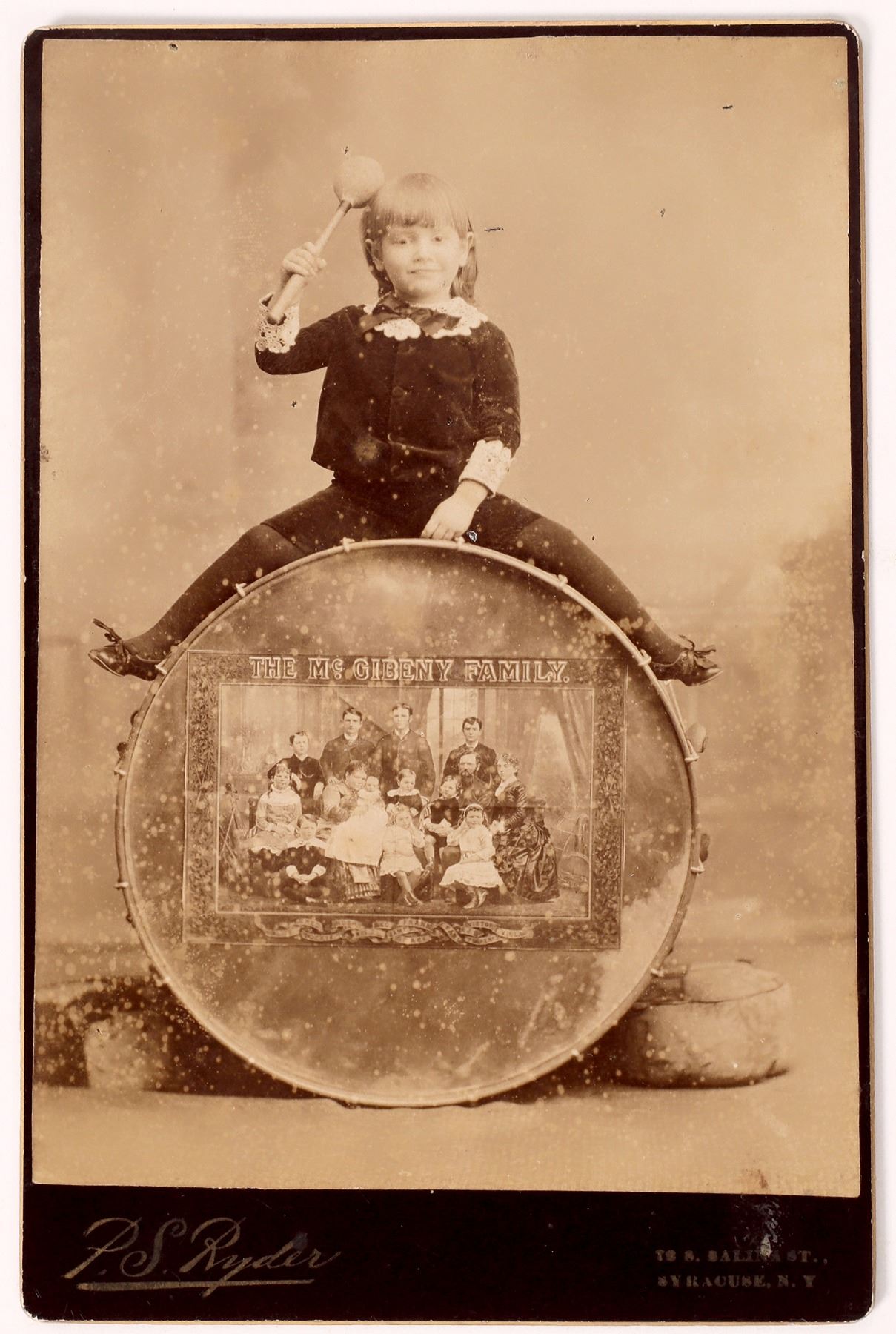Young girl sitting on top of a bass drum with The McGibney Family photo adhered to drum head. The McGibney's claimed to be the largest musical family in America if not the world with 2 parents and 12 children in the orchestra. Photo by PS Ryder, 5.75x4".