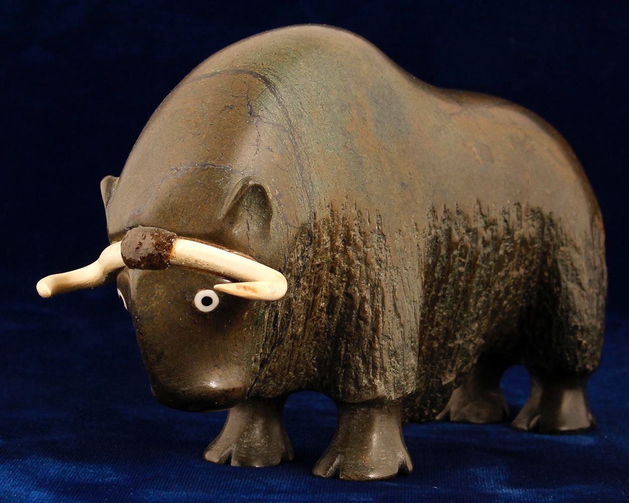 This 8" long piece features a musk ox carved in green stone. Two ivory horns.
