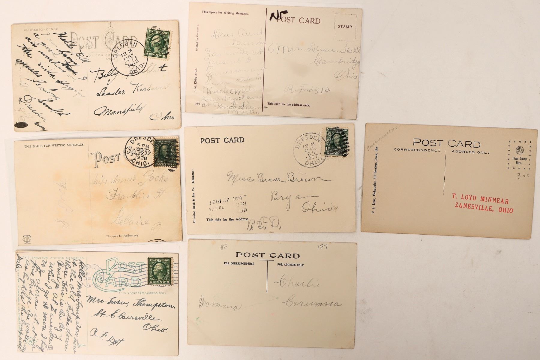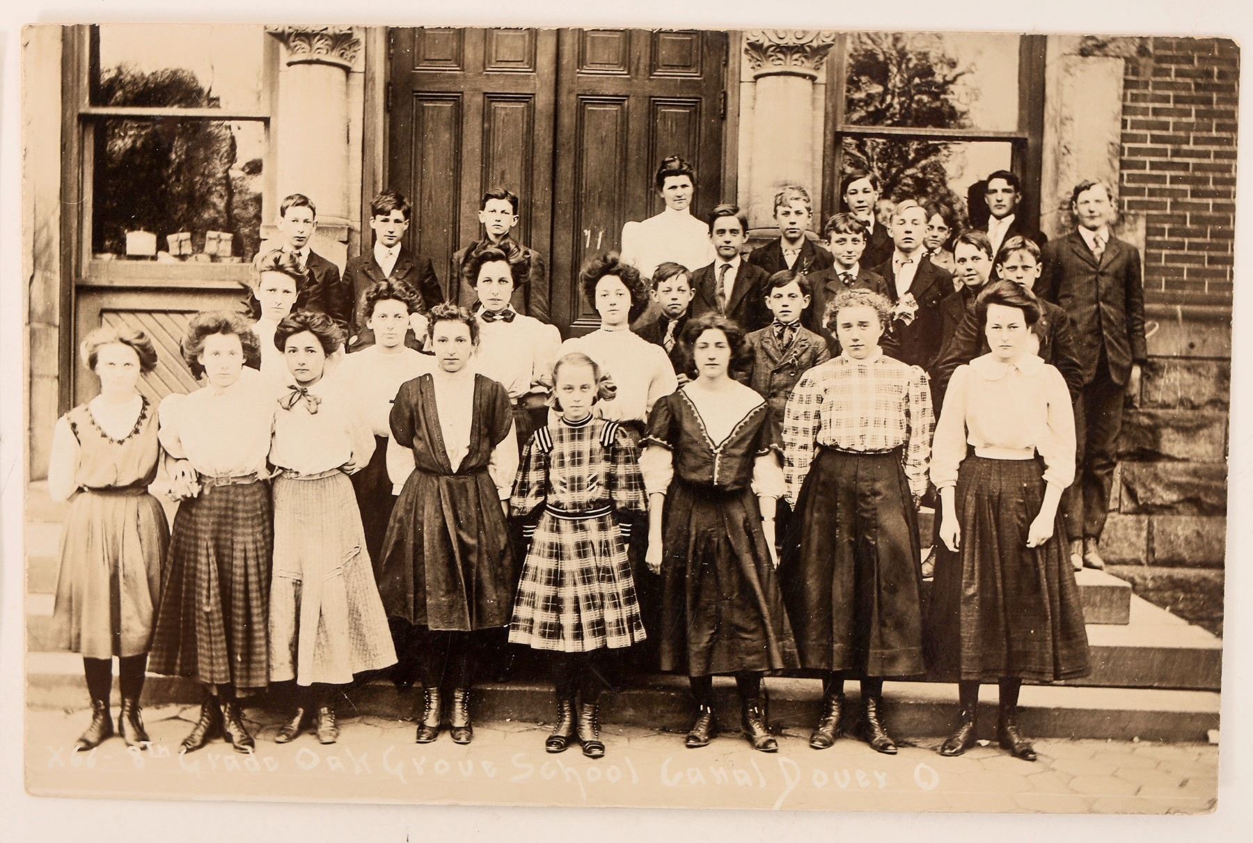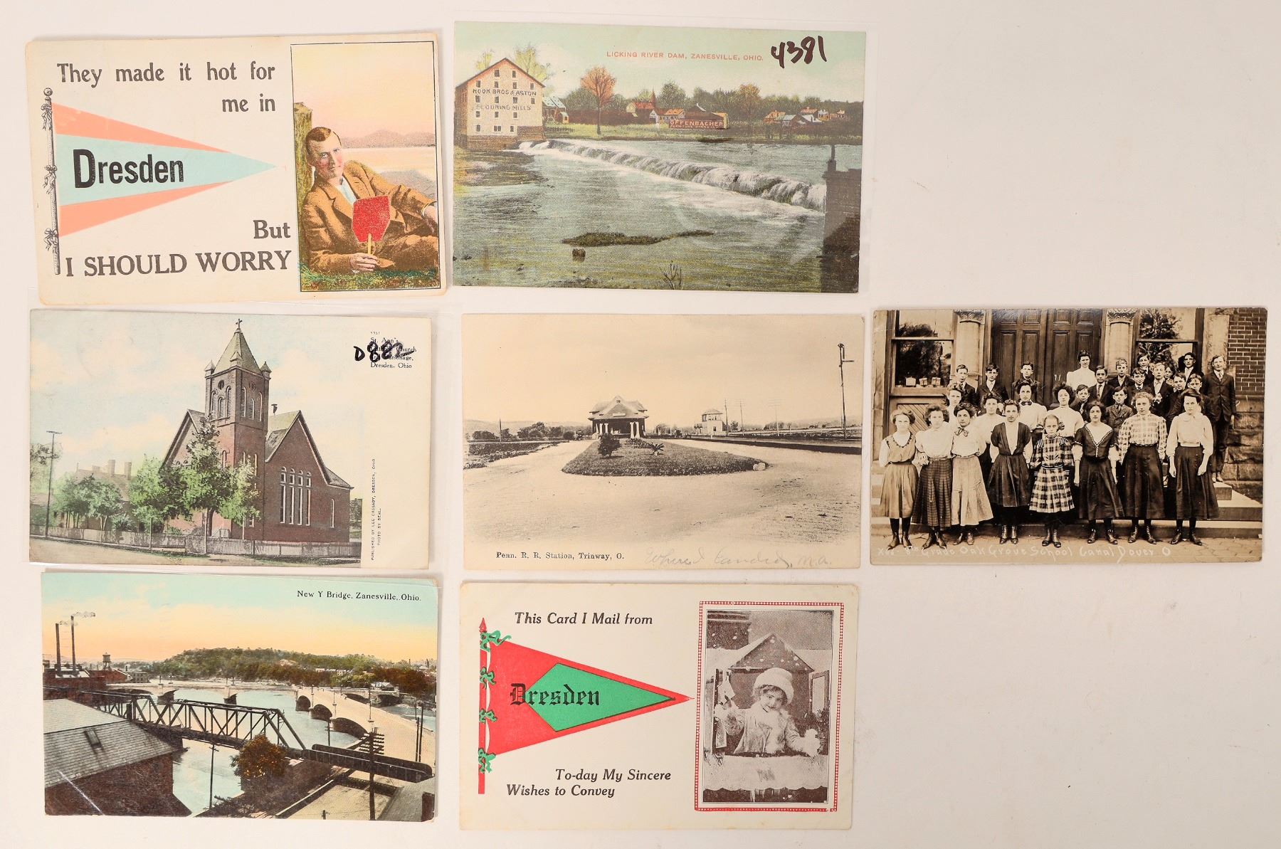 A collection of 7 postcards from Muskingum Co., Ohio, c1908-1913. Oak Grove School 8th grade class photo, Canal Dover, OH, Trinway Penn. RR Station, Zanesville New Y Bridge, St. Ann's Catholic Church, Dresden, etc.[ Ohio