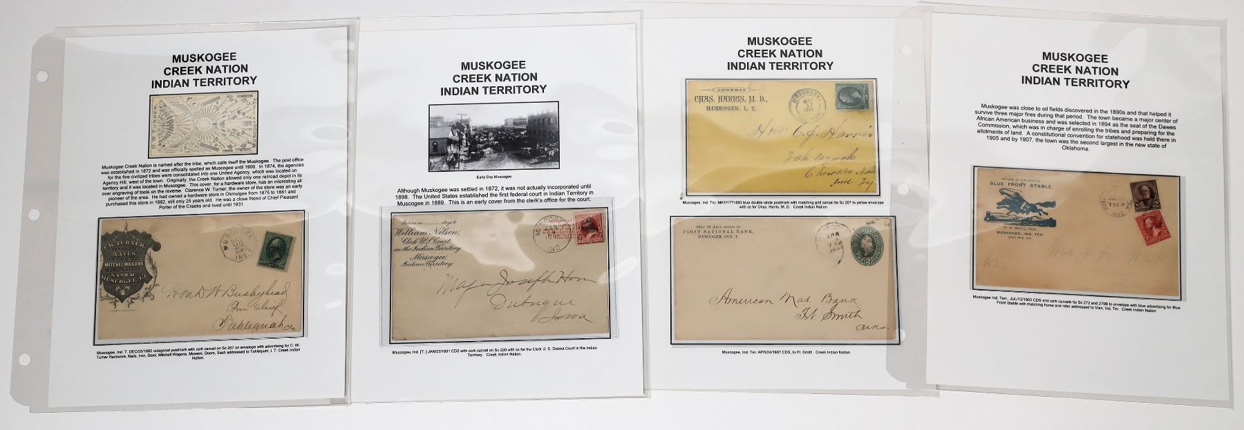 Lot of five very nice covers. 1) Octagonal 1882 with cork cancel. Large Turner corner advertising. More impressive is the reverse with 50 or so tools (See top of photograph). Turner was an early pioneer and close friend of Chief Pleasant Porter. 2) A pictorial advertising corner in blue of a man on horseback riding fast. Blue Front Stable, OH Sholl. 1903 CDS with cork cancels. Has a 2c Sc272 and 8c 279B. 3) William Nelson clerk of Indian Territory court. 1891 CDS. The first Federal Court was established here in 1889. 4) Ch. Harris, MD corner cover. Double circle. 1883. 5) First National Bank. 1897. Addressed to Fort Smith.