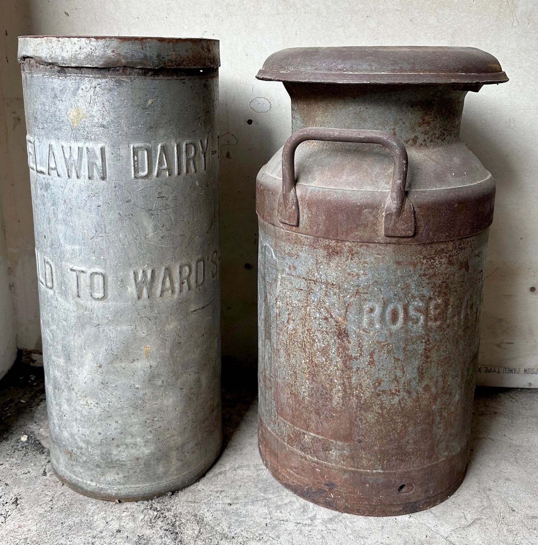 Two milk tins from Muskogee. Roselawn Dairy, "Sold to Ward's 47", 8" diameter, 20" tall; 5 gallon milk tin embossed Roselawn Dairy". Bracken Collection. Neither piece has the Muskogee designation. Oklahoma Muskogee