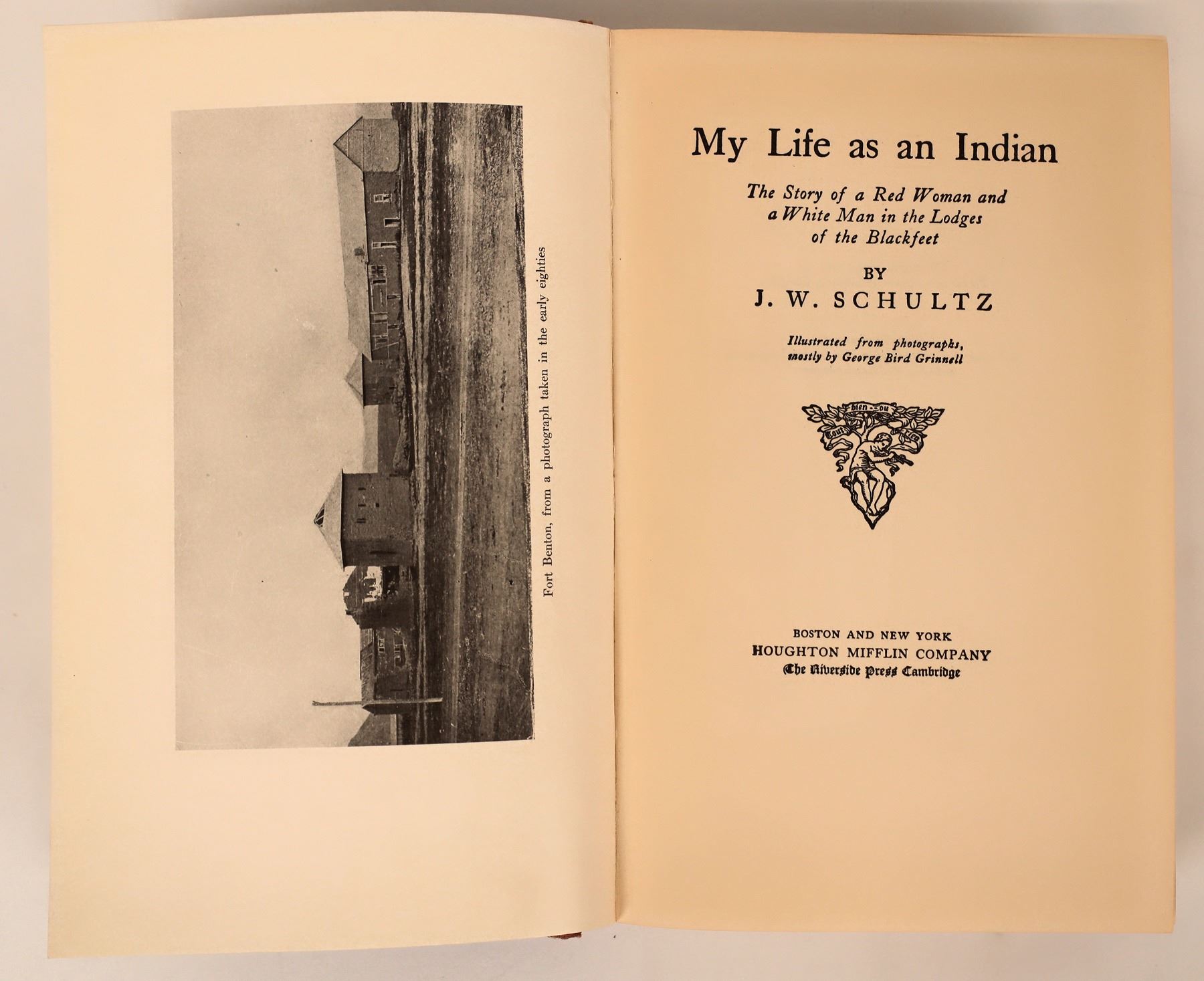 A book by J.W. Schultz "My Life as an Indian" tells the experiences of the author' experiences living with the Blackfeet people. Book has a 1907 copyright, is 426 pages and has some bindery separation. See the Books section for other American Indian reference works. 1907