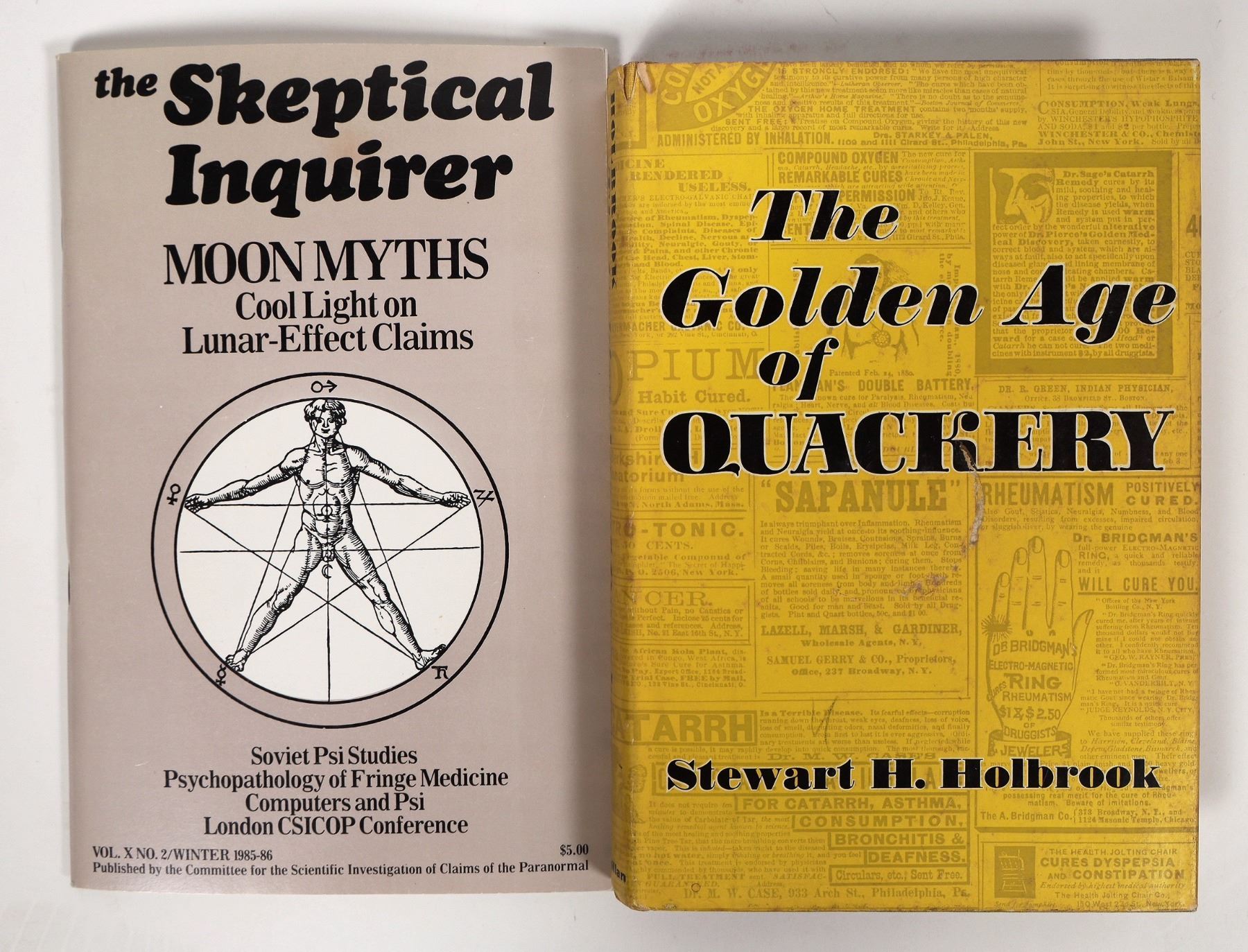 Two books dealing with debunking. First is "The Skeptical Inquirer" Cool Light on Lunar Effect Claims. This book is softcover and published in 1986. Next is "The Golden Age of Quackery" by Stewart H. Holbrook. It's a hardcover with dust jacket and was published in 1959. Both are in nice condition. Please see photos for more details.