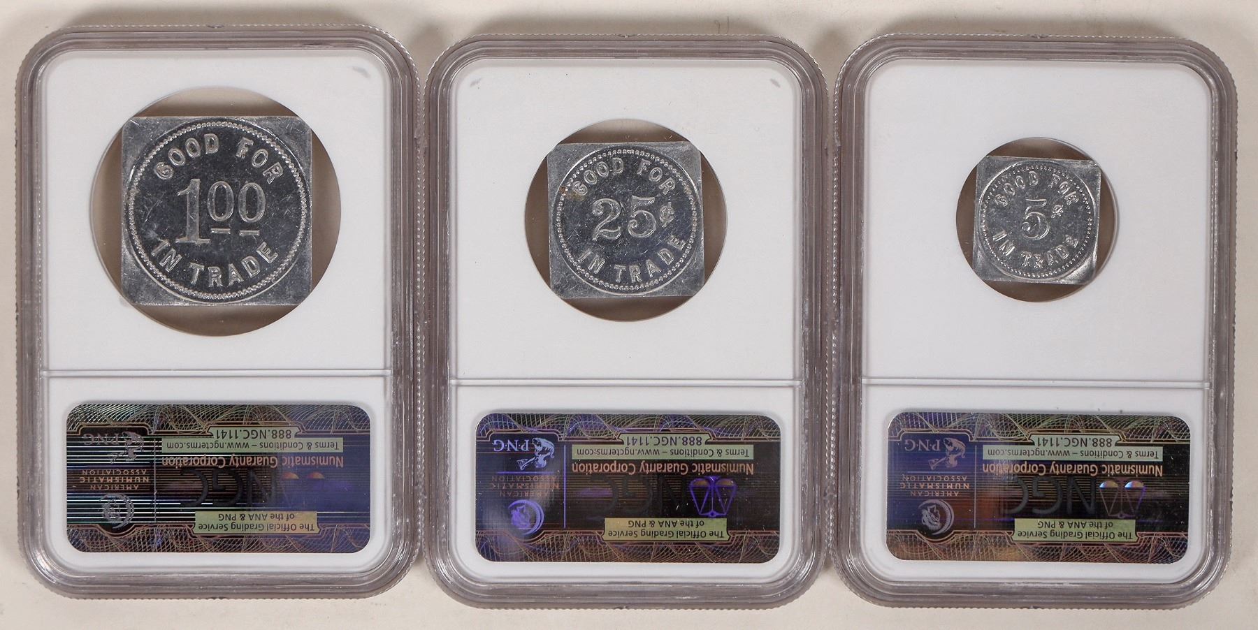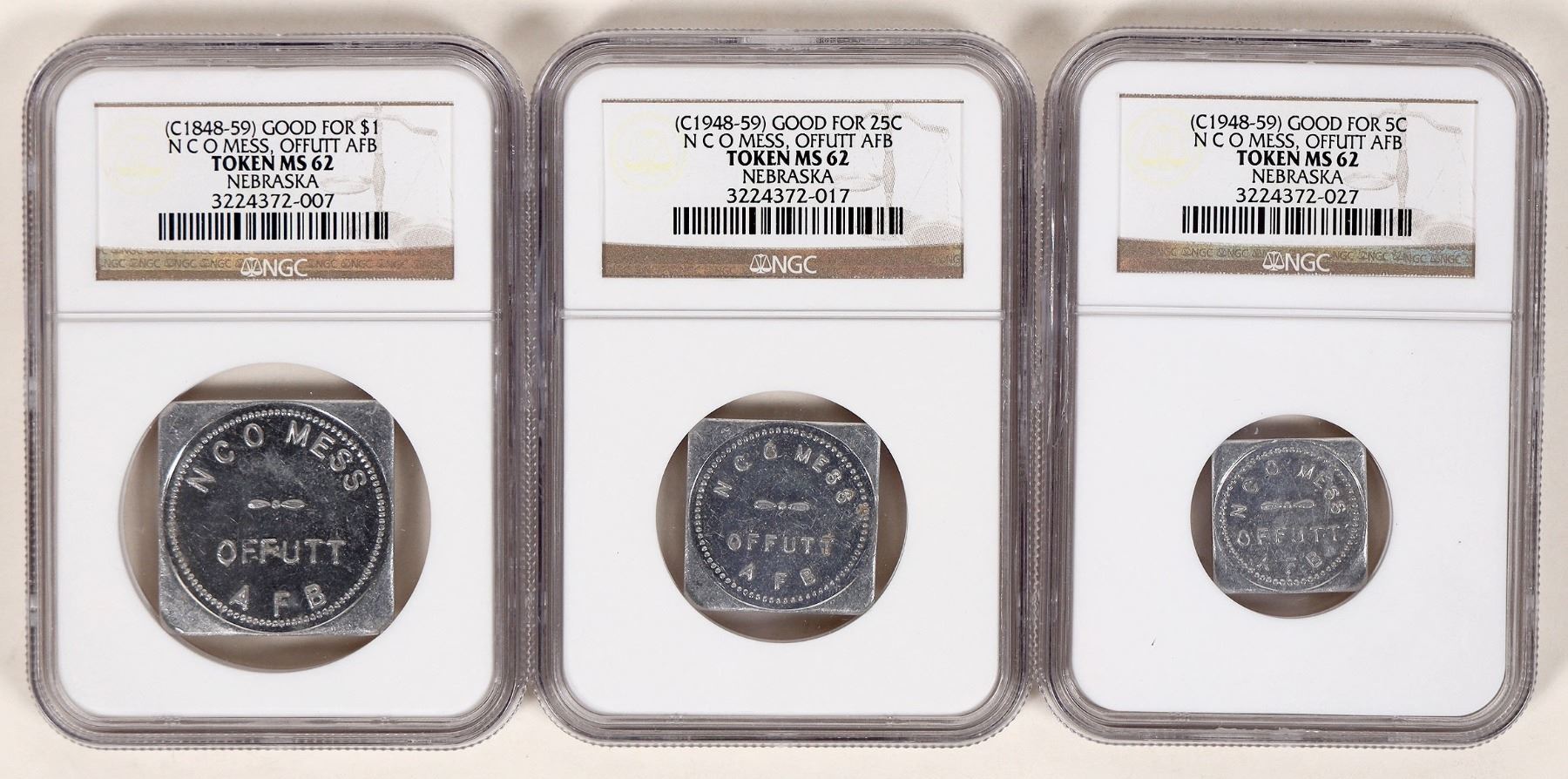 Brilliant uncirculated! Three NGC graded tokens, all MS 62. NCO MESS / OFFUTT / AFB // GOOD FOR / 5 /25c /$1.00 / IN TRADE; Al., Sq., 19, 23, 28 mm.