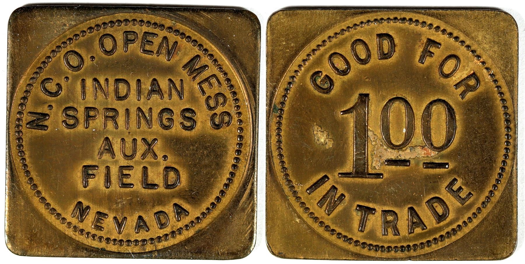 N.C.O. OPEN MESS / INDIAN / SPRINGS / AUX. / FIELD / NEVADA // GOOD FOR / 1.00 / IN TRADE; Br. Sq. 28 mm.