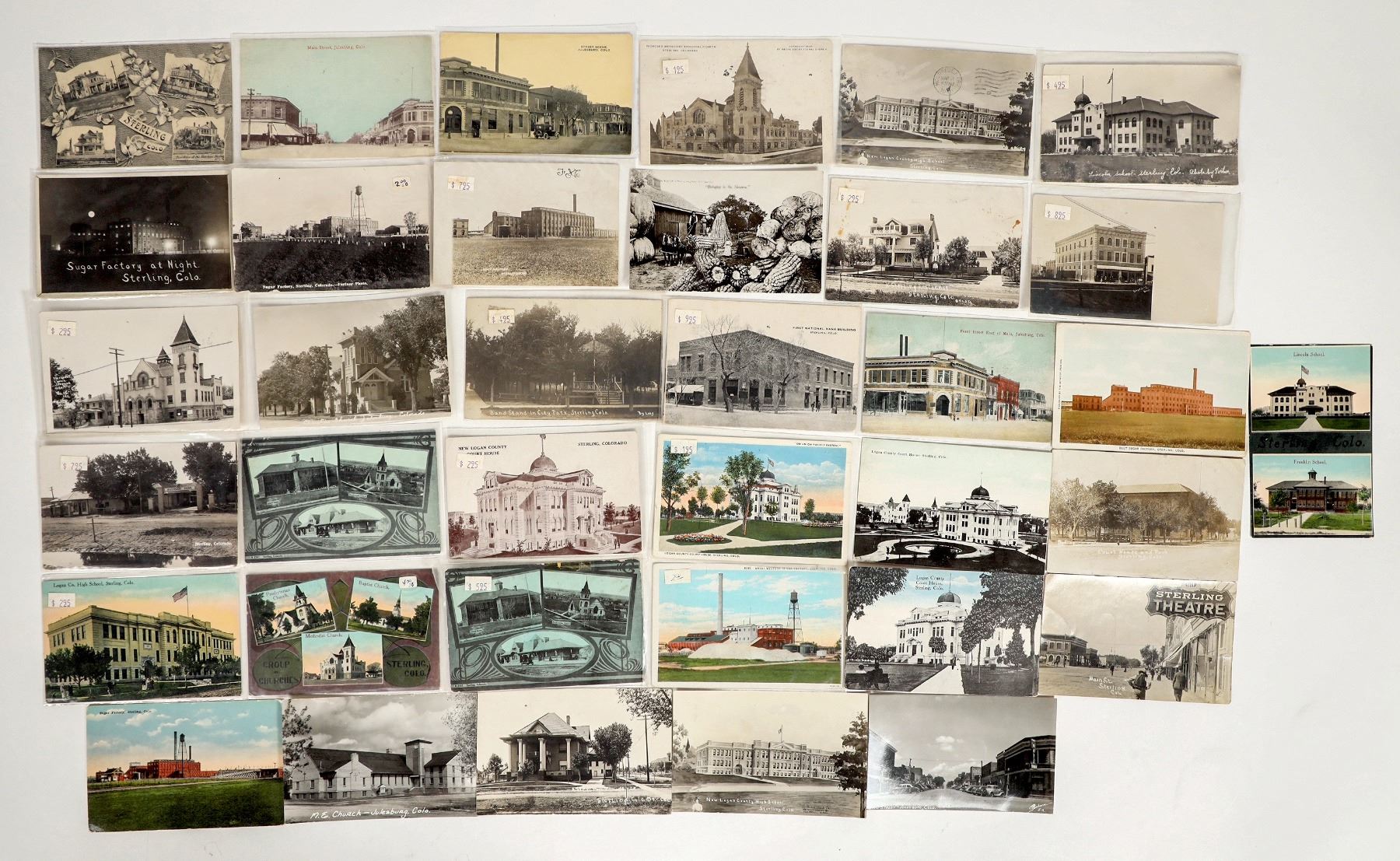 Lot of 34. Post cars of Sterling and Julesburg Colorado. 17 are RPC's. Postmarks: Sterling, CO. All are in protective sleeves and excellent cond. Various scenes : Main St, Julesburg, gov't bldg.'s, factory, Churches, parks.