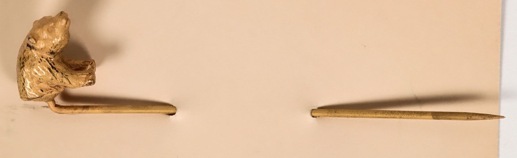 This N. O. S. stickpin has the front half of a golden bear. c1900. Three inches in length. Fabulous! (One of three California themed stick pins in this auction. They would make a nice collection.)