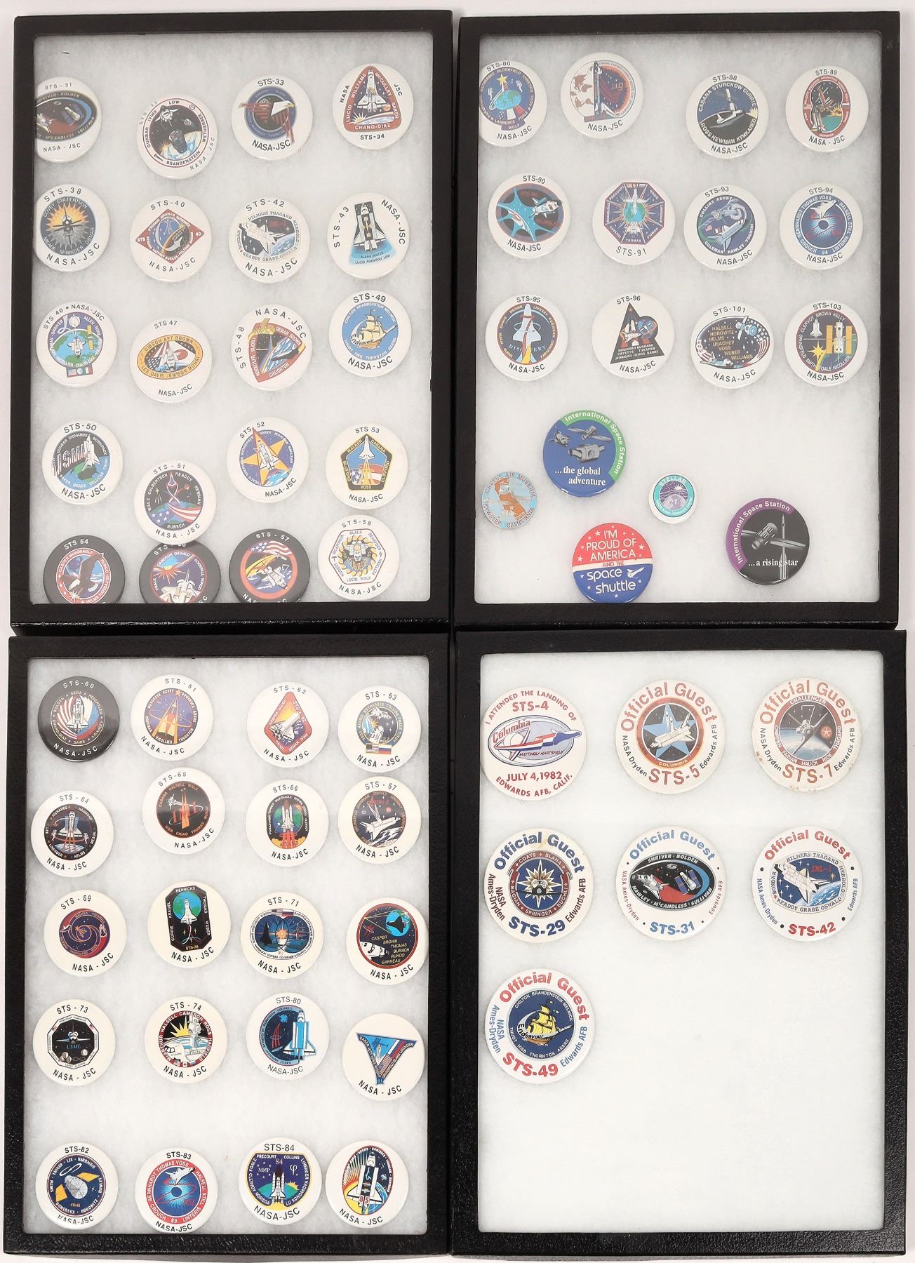 Lot of 63. Collection of NASA-JSC STS pins in four Riker display boxes. 2" mission and guest pins. covers the majority of the flights: STS-31 thru STS 103 missing 10 in the sequence. Six Official Guest pins for STS 4,5,7,29,31,42,49 and remaining misc. pins. All in excellent cond.