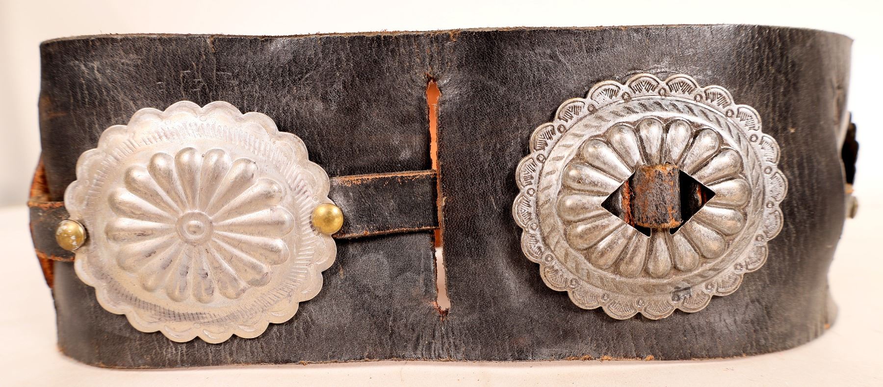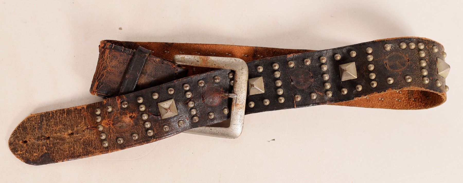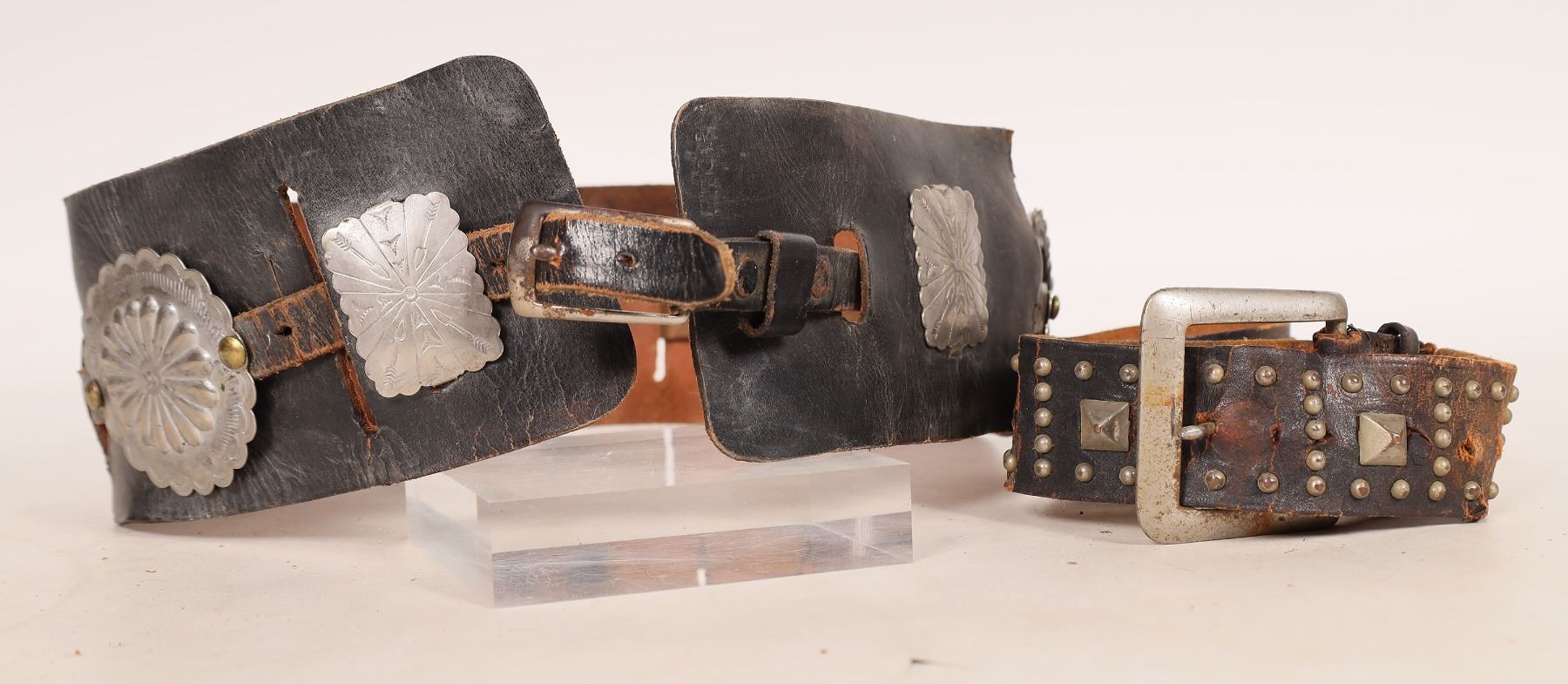 2 Hollywood props leather belts. Studded belt with points and some jewels removed, 28", stamped NBC prop on back. Size 34 black leather with 7 conchos, stamped FOX PROP on back. [Hollywood] [California]